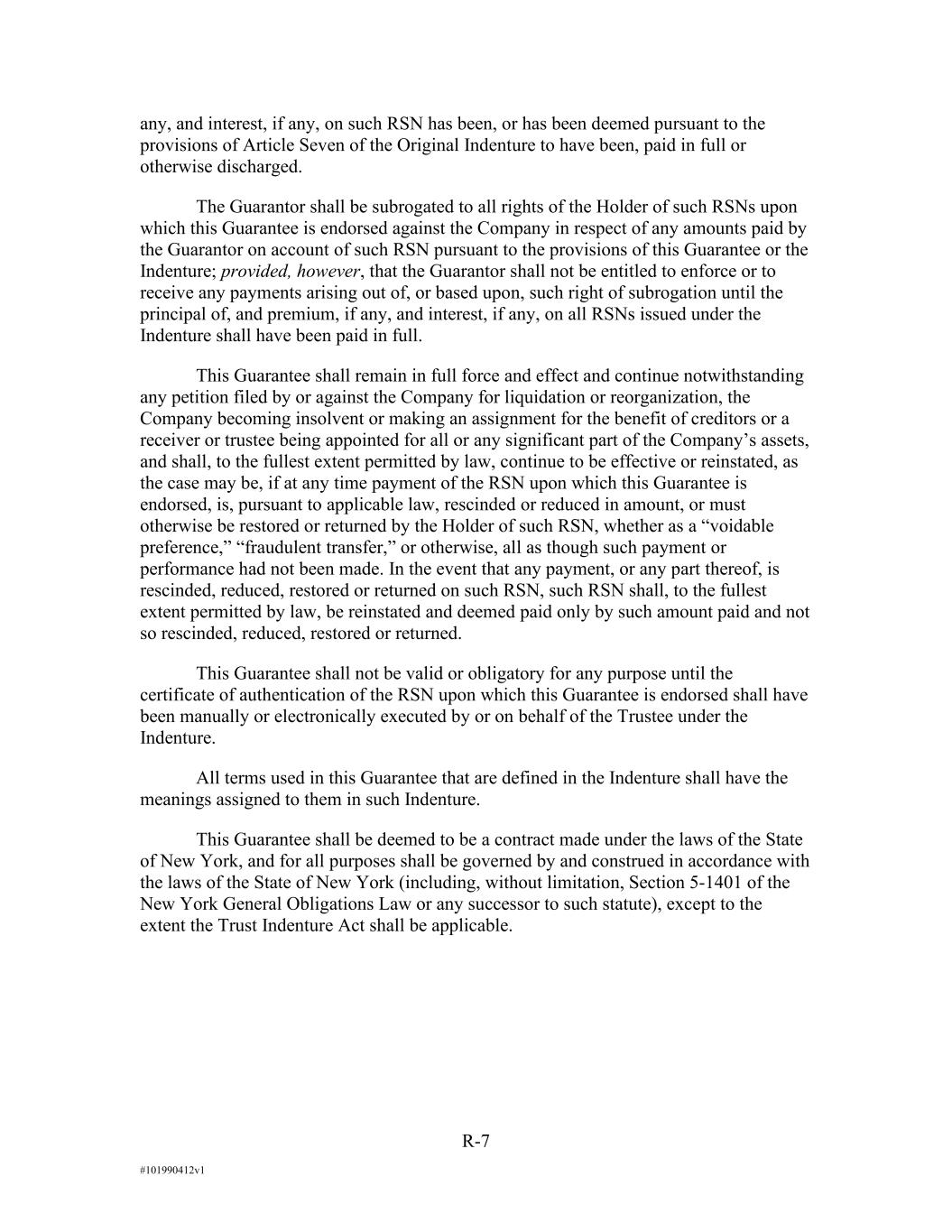 R-7 #101990412v1 any, and interest, if any, on such RSN has been, or has been deemed pursuant to the provisions of Article Seven of the Original Indenture to have been, paid in full or otherwise discharged. The Guarantor shall be subrogated to all rights of the Holder of such RSNs upon which this Guarantee is endorsed against the Company in respect of any amounts paid by the Guarantor on account of such RSN pursuant to the provisions of this Guarantee or the Indenture; provided, however, that the Guarantor shall not be entitled to enforce or to receive any payments arising out of, or based upon, such right of subrogation until the principal of, and premium, if any, and interest, if any, on all RSNs issued under the Indenture shall have been paid in full. This Guarantee shall remain in full force and effect and continue notwithstanding any petition filed by or against the Company for liquidation or reorganization, the Company becoming insolvent or making an assignment for the benefit of creditors or a receiver or trustee being appointed for all or any significant part of the Company’s assets, and shall, to the fullest extent permitted by law, continue to be effective or reinstated, as the case may be, if at any time payment of the RSN upon which this Guarantee is endorsed, is, pursuant to applicable law, rescinded or reduced in amount, or must otherwise be restored or returned by the Holder of such RSN, whether as a “voidable preference,” “fraudulent transfer,” or otherwise, all as though such payment or performance had not been made. In the event that any payment, or any part thereof, is rescinded, reduced, restored or returned on such RSN, such RSN shall, to the fullest extent permitted by law, be reinstated and deemed paid only by such amount paid and not so rescinded, reduced, restored or returned. This Guarantee shall not be valid or obligatory for any purpose until the certificate of authentication of the RSN upon which this Guarantee is endorsed shall have been manually or electronically executed by or on behalf of the Trustee under the Indenture. All terms used in this Guarantee that are defined in the Indenture shall have the meanings assigned to them in such Indenture. This Guarantee shall be deemed to be a contract made under the laws of the State of New York, and for all purposes shall be governed by and construed in accordance with the laws of the State of New York (including, without limitation, Section 5-1401 of the New York General Obligations Law or any successor to such statute), except to the extent the Trust Indenture Act shall be applicable.