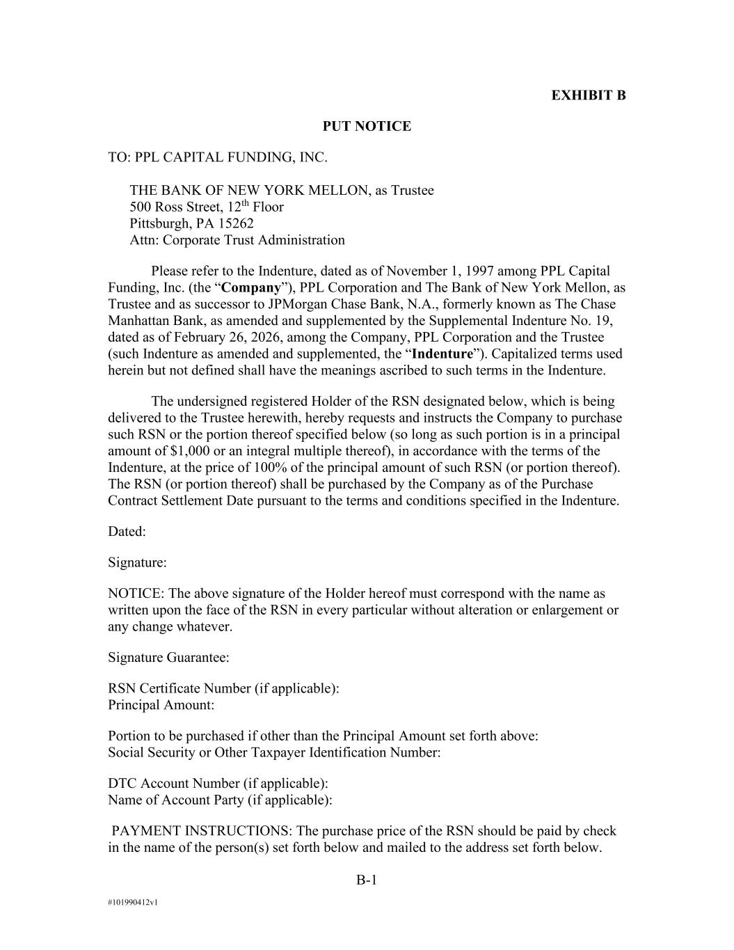 B-1 #101990412v1 EXHIBIT B PUT NOTICE TO: PPL CAPITAL FUNDING, INC. THE BANK OF NEW YORK MELLON, as Trustee 500 Ross Street, 12th Floor Pittsburgh, PA 15262 Attn: Corporate Trust Administration Please refer to the Indenture, dated as of November 1, 1997 among PPL Capital Funding, Inc. (the “Company”), PPL Corporation and The Bank of New York Mellon, as Trustee and as successor to JPMorgan Chase Bank, N.A., formerly known as The Chase Manhattan Bank, as amended and supplemented by the Supplemental Indenture No. 19, dated as of February 26, 2026, among the Company, PPL Corporation and the Trustee (such Indenture as amended and supplemented, the “Indenture”). Capitalized terms used herein but not defined shall have the meanings ascribed to such terms in the Indenture. The undersigned registered Holder of the RSN designated below, which is being delivered to the Trustee herewith, hereby requests and instructs the Company to purchase such RSN or the portion thereof specified below (so long as such portion is in a principal amount of $1,000 or an integral multiple thereof), in accordance with the terms of the Indenture, at the price of 100% of the principal amount of such RSN (or portion thereof). The RSN (or portion thereof) shall be purchased by the Company as of the Purchase Contract Settlement Date pursuant to the terms and conditions specified in the Indenture. Dated: Signature: NOTICE: The above signature of the Holder hereof must correspond with the name as written upon the face of the RSN in every particular without alteration or enlargement or any change whatever. Signature Guarantee: RSN Certificate Number (if applicable): Principal Amount: Portion to be purchased if other than the Principal Amount set forth above: Social Security or Other Taxpayer Identification Number: DTC Account Number (if applicable): Name of Account Party (if applicable): PAYMENT INSTRUCTIONS: The purchase price of the RSN should be paid by check in the name of the person(s) set forth below and mailed to the address set forth below.