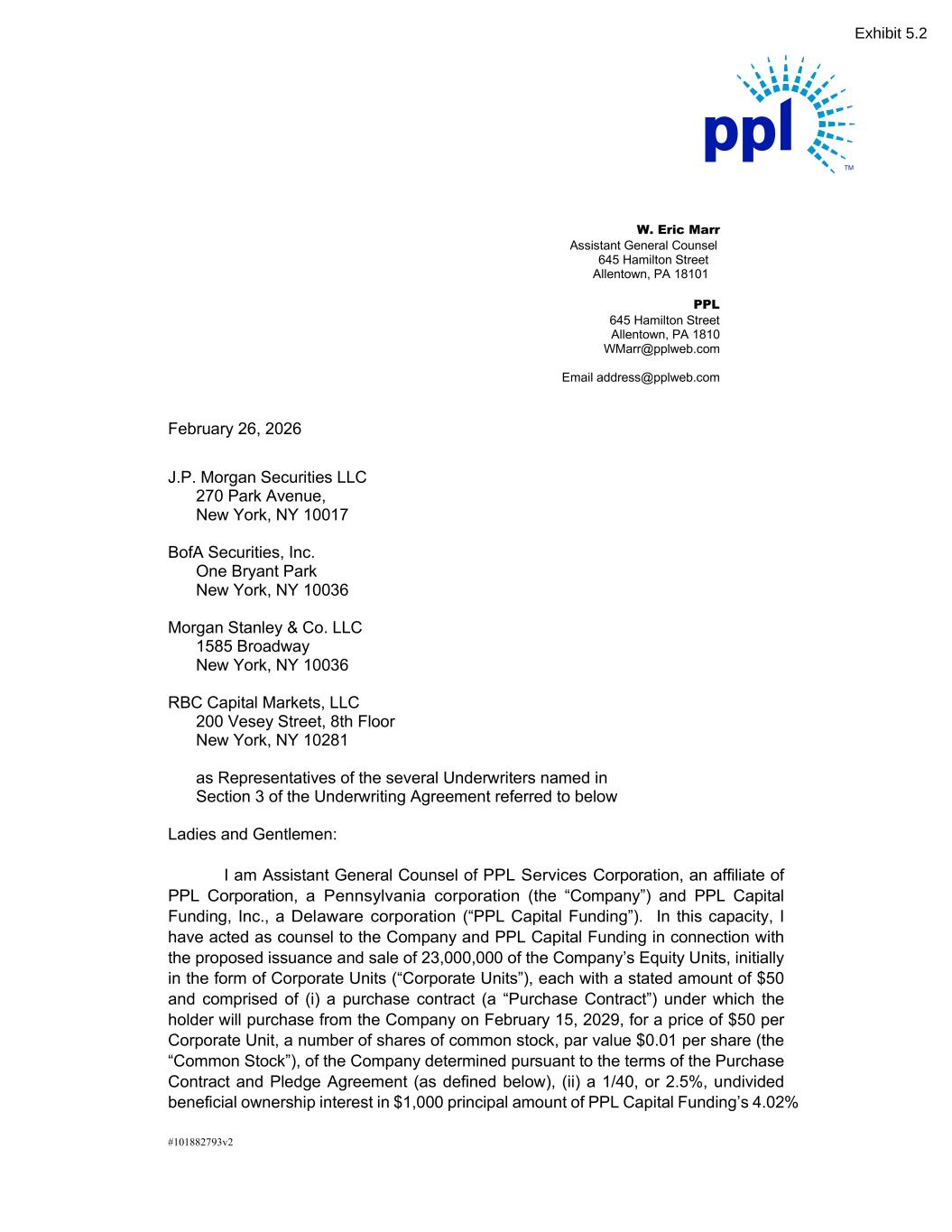 #101882793v2 February 26, 2026 J.P. Morgan Securities LLC 270 Park Avenue, New York, NY 10017 BofA Securities, Inc. One Bryant Park New York, NY 10036 Morgan Stanley & Co. LLC 1585 Broadway New York, NY 10036 RBC Capital Markets, LLC 200 Vesey Street, 8th Floor New York, NY 10281 as Representatives of the several Underwriters named in Section 3 of the Underwriting Agreement referred to below Ladies and Gentlemen: I am Assistant General Counsel of PPL Services Corporation, an affiliate of PPL Corporation, a Pennsylvania corporation (the “Company”) and PPL Capital Funding, Inc., a Delaware corporation (“PPL Capital Funding”). In this capacity, I have acted as counsel to the Company and PPL Capital Funding in connection with the proposed issuance and sale of 23,000,000 of the Company’s Equity Units, initially in the form of Corporate Units (“Corporate Units”), each with a stated amount of $50 and comprised of (i) a purchase contract (a “Purchase Contract”) under which the holder will purchase from the Company on February 15, 2029, for a price of $50 per Corporate Unit, a number of shares of common stock, par value $0.01 per share (the “Common Stock”), of the Company determined pursuant to the terms of the Purchase Contract and Pledge Agreement (as defined below), (ii) a 1/40, or 2.5%, undivided beneficial ownership interest in $1,000 principal amount of PPL Capital Funding’s 4.02% W. Eric Marr Assistant General Counsel 645 Hamilton Street Allentown, PA 18101 PPL 645 Hamilton Street Allentown, PA 1810 WMarr@pplweb.com Email address@pplweb.com