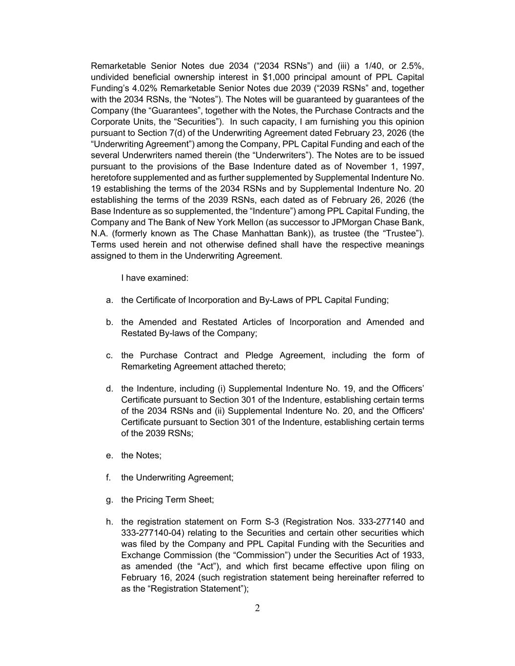 2 Remarketable Senior Notes due 2034 (“2034 RSNs”) and (iii) a 1/40, or 2.5%, undivided beneficial ownership interest in $1,000 principal amount of PPL Capital Funding’s 4.02% Remarketable Senior Notes due 2039 (“2039 RSNs” and, together with the 2034 RSNs, the “Notes”). The Notes will be guaranteed by guarantees of the Company (the “Guarantees”, together with the Notes, the Purchase Contracts and the Corporate Units, the “Securities”). In such capacity, I am furnishing you this opinion pursuant to Section 7(d) of the Underwriting Agreement dated February 23, 2026 (the “Underwriting Agreement”) among the Company, PPL Capital Funding and each of the several Underwriters named therein (the “Underwriters”). The Notes are to be issued pursuant to the provisions of the Base Indenture dated as of November 1, 1997, heretofore supplemented and as further supplemented by Supplemental Indenture No. 19 establishing the terms of the 2034 RSNs and by Supplemental Indenture No. 20 establishing the terms of the 2039 RSNs, each dated as of February 26, 2026 (the Base Indenture as so supplemented, the “Indenture”) among PPL Capital Funding, the Company and The Bank of New York Mellon (as successor to JPMorgan Chase Bank, N.A. (formerly known as The Chase Manhattan Bank)), as trustee (the “Trustee”). Terms used herein and not otherwise defined shall have the respective meanings assigned to them in the Underwriting Agreement. I have examined: a. the Certificate of Incorporation and By-Laws of PPL Capital Funding; b. the Amended and Restated Articles of Incorporation and Amended and Restated By-laws of the Company; c. the Purchase Contract and Pledge Agreement, including the form of Remarketing Agreement attached thereto; d. the Indenture, including (i) Supplemental Indenture No. 19, and the Officers’ Certificate pursuant to Section 301 of the Indenture, establishing certain terms of the 2034 RSNs and (ii) Supplemental Indenture No. 20, and the Officers' Certificate pursuant to Section 301 of the Indenture, establishing certain terms of the 2039 RSNs; e. the Notes; f. the Underwriting Agreement; g. the Pricing Term Sheet; h. the registration statement on Form S-3 (Registration Nos. 333-277140 and 333-277140-04) relating to the Securities and certain other securities which was filed by the Company and PPL Capital Funding with the Securities and Exchange Commission (the “Commission”) under the Securities Act of 1933, as amended (the “Act”), and which first became effective upon filing on February 16, 2024 (such registration statement being hereinafter referred to as the “Registration Statement”);