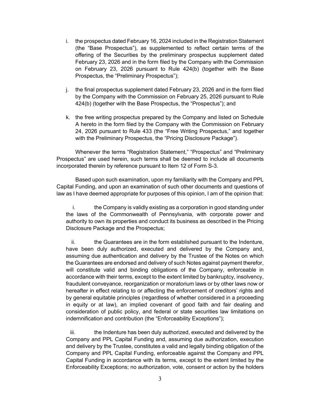 3 i. the prospectus dated February 16, 2024 included in the Registration Statement (the “Base Prospectus”), as supplemented to reflect certain terms of the offering of the Securities by the preliminary prospectus supplement dated February 23, 2026 and in the form filed by the Company with the Commission on February 23, 2026 pursuant to Rule 424(b) (together with the Base Prospectus, the “Preliminary Prospectus”); j. the final prospectus supplement dated February 23, 2026 and in the form filed by the Company with the Commission on February 25, 2026 pursuant to Rule 424(b) (together with the Base Prospectus, the “Prospectus”); and k. the free writing prospectus prepared by the Company and listed on Schedule A hereto in the form filed by the Company with the Commission on February 24, 2026 pursuant to Rule 433 (the “Free Writing Prospectus,” and together with the Preliminary Prospectus, the “Pricing Disclosure Package”). Whenever the terms “Registration Statement,” “Prospectus” and “Preliminary Prospectus” are used herein, such terms shall be deemed to include all documents incorporated therein by reference pursuant to Item 12 of Form S-3. Based upon such examination, upon my familiarity with the Company and PPL Capital Funding, and upon an examination of such other documents and questions of law as I have deemed appropriate for purposes of this opinion, I am of the opinion that: i. the Company is validly existing as a corporation in good standing under the laws of the Commonwealth of Pennsylvania, with corporate power and authority to own its properties and conduct its business as described in the Pricing Disclosure Package and the Prospectus; ii. the Guarantees are in the form established pursuant to the Indenture, have been duly authorized, executed and delivered by the Company and, assuming due authentication and delivery by the Trustee of the Notes on which the Guarantees are endorsed and delivery of such Notes against payment therefor, will constitute valid and binding obligations of the Company, enforceable in accordance with their terms, except to the extent limited by bankruptcy, insolvency, fraudulent conveyance, reorganization or moratorium laws or by other laws now or hereafter in effect relating to or affecting the enforcement of creditors’ rights and by general equitable principles (regardless of whether considered in a proceeding in equity or at law), an implied covenant of good faith and fair dealing and consideration of public policy, and federal or state securities law limitations on indemnification and contribution (the “Enforceability Exceptions”); iii. the Indenture has been duly authorized, executed and delivered by the Company and PPL Capital Funding and, assuming due authorization, execution and delivery by the Trustee, constitutes a valid and legally binding obligation of the Company and PPL Capital Funding, enforceable against the Company and PPL Capital Funding in accordance with its terms, except to the extent limited by the Enforceability Exceptions; no authorization, vote, consent or action by the holders