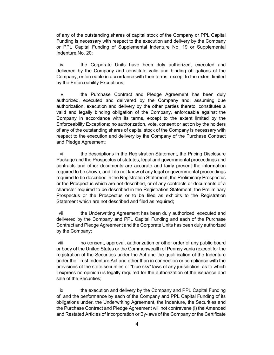 4 of any of the outstanding shares of capital stock of the Company or PPL Capital Funding is necessary with respect to the execution and delivery by the Company or PPL Capital Funding of Supplemental Indenture No. 19 or Supplemental Indenture No. 20; iv. the Corporate Units have been duly authorized, executed and delivered by the Company and constitute valid and binding obligations of the Company, enforceable in accordance with their terms, except to the extent limited by the Enforceability Exceptions; v. the Purchase Contract and Pledge Agreement has been duly authorized, executed and delivered by the Company and, assuming due authorization, execution and delivery by the other parties thereto, constitutes a valid and legally binding obligation of the Company, enforceable against the Company in accordance with its terms, except to the extent limited by the Enforceability Exceptions; no authorization, vote, consent or action by the holders of any of the outstanding shares of capital stock of the Company is necessary with respect to the execution and delivery by the Company of the Purchase Contract and Pledge Agreement; vi. the descriptions in the Registration Statement, the Pricing Disclosure Package and the Prospectus of statutes, legal and governmental proceedings and contracts and other documents are accurate and fairly present the information required to be shown, and I do not know of any legal or governmental proceedings required to be described in the Registration Statement, the Preliminary Prospectus or the Prospectus which are not described, or of any contracts or documents of a character required to be described in the Registration Statement, the Preliminary Prospectus or the Prospectus or to be filed as exhibits to the Registration Statement which are not described and filed as required; vii. the Underwriting Agreement has been duly authorized, executed and delivered by the Company and PPL Capital Funding and each of the Purchase Contract and Pledge Agreement and the Corporate Units has been duly authorized by the Company; viii. no consent, approval, authorization or other order of any public board or body of the United States or the Commonwealth of Pennsylvania (except for the registration of the Securities under the Act and the qualification of the Indenture under the Trust Indenture Act and other than in connection or compliance with the provisions of the state securities or “blue sky” laws of any jurisdiction, as to which I express no opinion) is legally required for the authorization of the issuance and sale of the Securities; ix. the execution and delivery by the Company and PPL Capital Funding of, and the performance by each of the Company and PPL Capital Funding of its obligations under, the Underwriting Agreement, the Indenture, the Securities and the Purchase Contract and Pledge Agreement will not contravene (i) the Amended and Restated Articles of Incorporation or By-laws of the Company or the Certificate