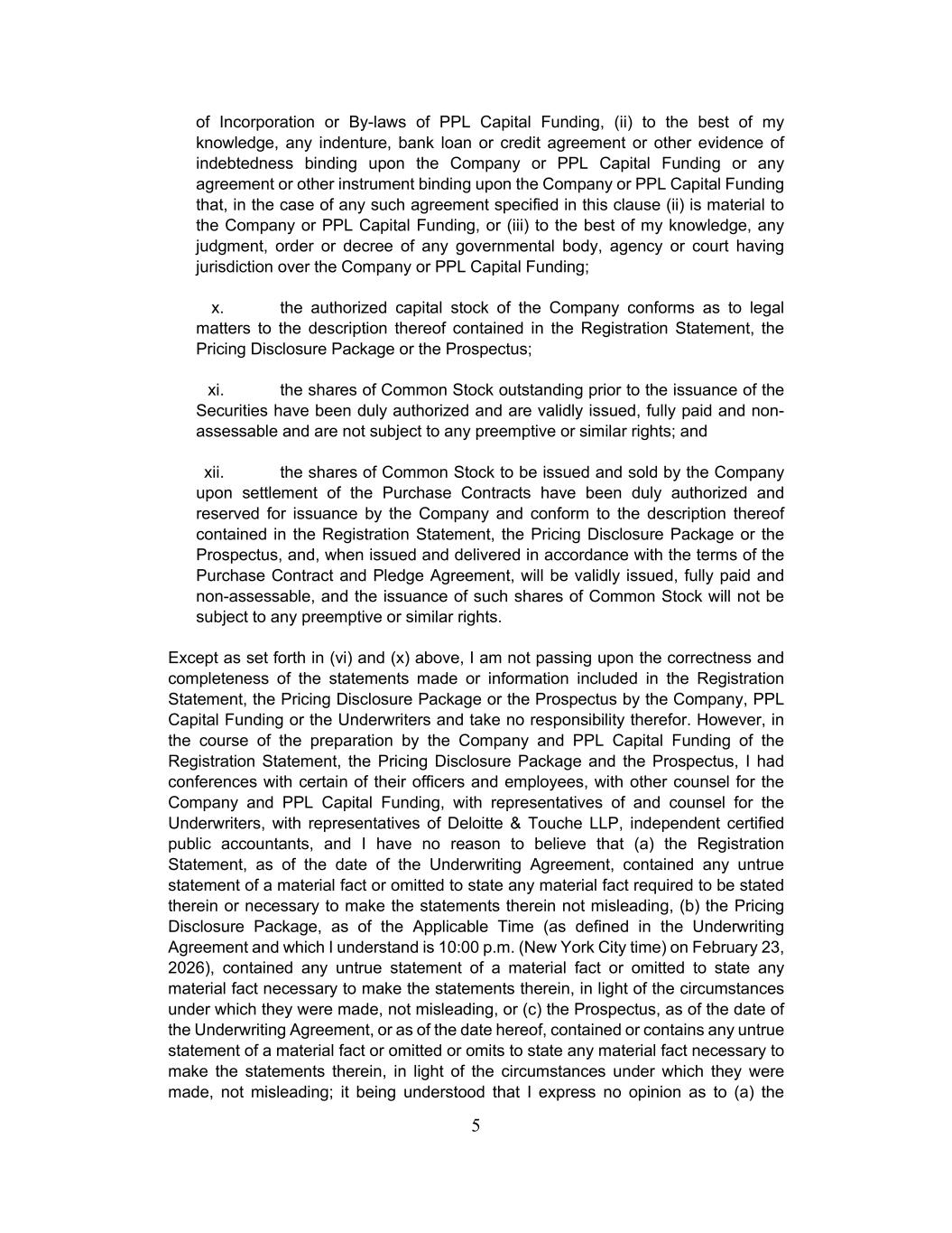 5 of Incorporation or By-laws of PPL Capital Funding, (ii) to the best of my knowledge, any indenture, bank loan or credit agreement or other evidence of indebtedness binding upon the Company or PPL Capital Funding or any agreement or other instrument binding upon the Company or PPL Capital Funding that, in the case of any such agreement specified in this clause (ii) is material to the Company or PPL Capital Funding, or (iii) to the best of my knowledge, any judgment, order or decree of any governmental body, agency or court having jurisdiction over the Company or PPL Capital Funding; x. the authorized capital stock of the Company conforms as to legal matters to the description thereof contained in the Registration Statement, the Pricing Disclosure Package or the Prospectus; xi. the shares of Common Stock outstanding prior to the issuance of the Securities have been duly authorized and are validly issued, fully paid and non- assessable and are not subject to any preemptive or similar rights; and xii. the shares of Common Stock to be issued and sold by the Company upon settlement of the Purchase Contracts have been duly authorized and reserved for issuance by the Company and conform to the description thereof contained in the Registration Statement, the Pricing Disclosure Package or the Prospectus, and, when issued and delivered in accordance with the terms of the Purchase Contract and Pledge Agreement, will be validly issued, fully paid and non-assessable, and the issuance of such shares of Common Stock will not be subject to any preemptive or similar rights. Except as set forth in (vi) and (x) above, I am not passing upon the correctness and completeness of the statements made or information included in the Registration Statement, the Pricing Disclosure Package or the Prospectus by the Company, PPL Capital Funding or the Underwriters and take no responsibility therefor. However, in the course of the preparation by the Company and PPL Capital Funding of the Registration Statement, the Pricing Disclosure Package and the Prospectus, I had conferences with certain of their officers and employees, with other counsel for the Company and PPL Capital Funding, with representatives of and counsel for the Underwriters, with representatives of Deloitte & Touche LLP, independent certified public accountants, and I have no reason to believe that (a) the Registration Statement, as of the date of the Underwriting Agreement, contained any untrue statement of a material fact or omitted to state any material fact required to be stated therein or necessary to make the statements therein not misleading, (b) the Pricing Disclosure Package, as of the Applicable Time (as defined in the Underwriting Agreement and which I understand is 10:00 p.m. (New York City time) on February 23, 2026), contained any untrue statement of a material fact or omitted to state any material fact necessary to make the statements therein, in light of the circumstances under which they were made, not misleading, or (c) the Prospectus, as of the date of the Underwriting Agreement, or as of the date hereof, contained or contains any untrue statement of a material fact or omitted or omits to state any material fact necessary to make the statements therein, in light of the circumstances under which they were made, not misleading; it being understood that I express no opinion as to (a) the