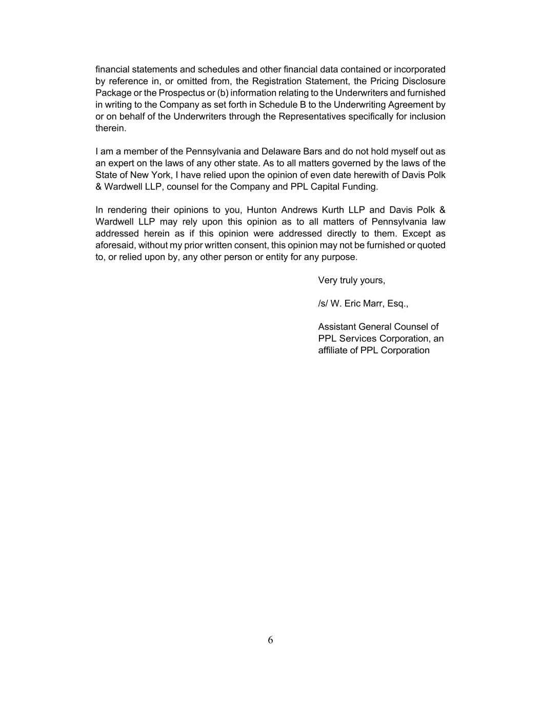 6 financial statements and schedules and other financial data contained or incorporated by reference in, or omitted from, the Registration Statement, the Pricing Disclosure Package or the Prospectus or (b) information relating to the Underwriters and furnished in writing to the Company as set forth in Schedule B to the Underwriting Agreement by or on behalf of the Underwriters through the Representatives specifically for inclusion therein. I am a member of the Pennsylvania and Delaware Bars and do not hold myself out as an expert on the laws of any other state. As to all matters governed by the laws of the State of New York, I have relied upon the opinion of even date herewith of Davis Polk & Wardwell LLP, counsel for the Company and PPL Capital Funding. In rendering their opinions to you, Hunton Andrews Kurth LLP and Davis Polk & Wardwell LLP may rely upon this opinion as to all matters of Pennsylvania law addressed herein as if this opinion were addressed directly to them. Except as aforesaid, without my prior written consent, this opinion may not be furnished or quoted to, or relied upon by, any other person or entity for any purpose. Very truly yours, /s/ W. Eric Marr, Esq., Assistant General Counsel of PPL Services Corporation, an affiliate of PPL Corporation