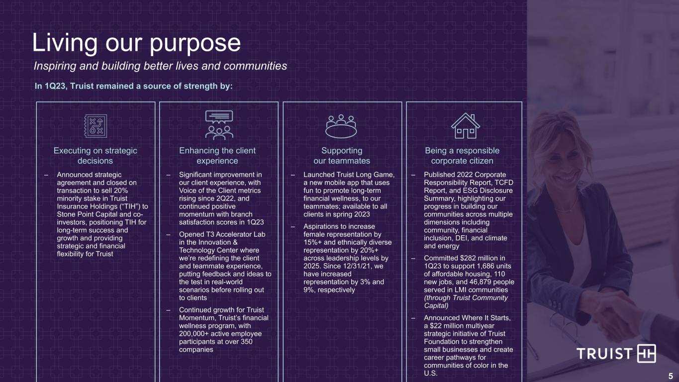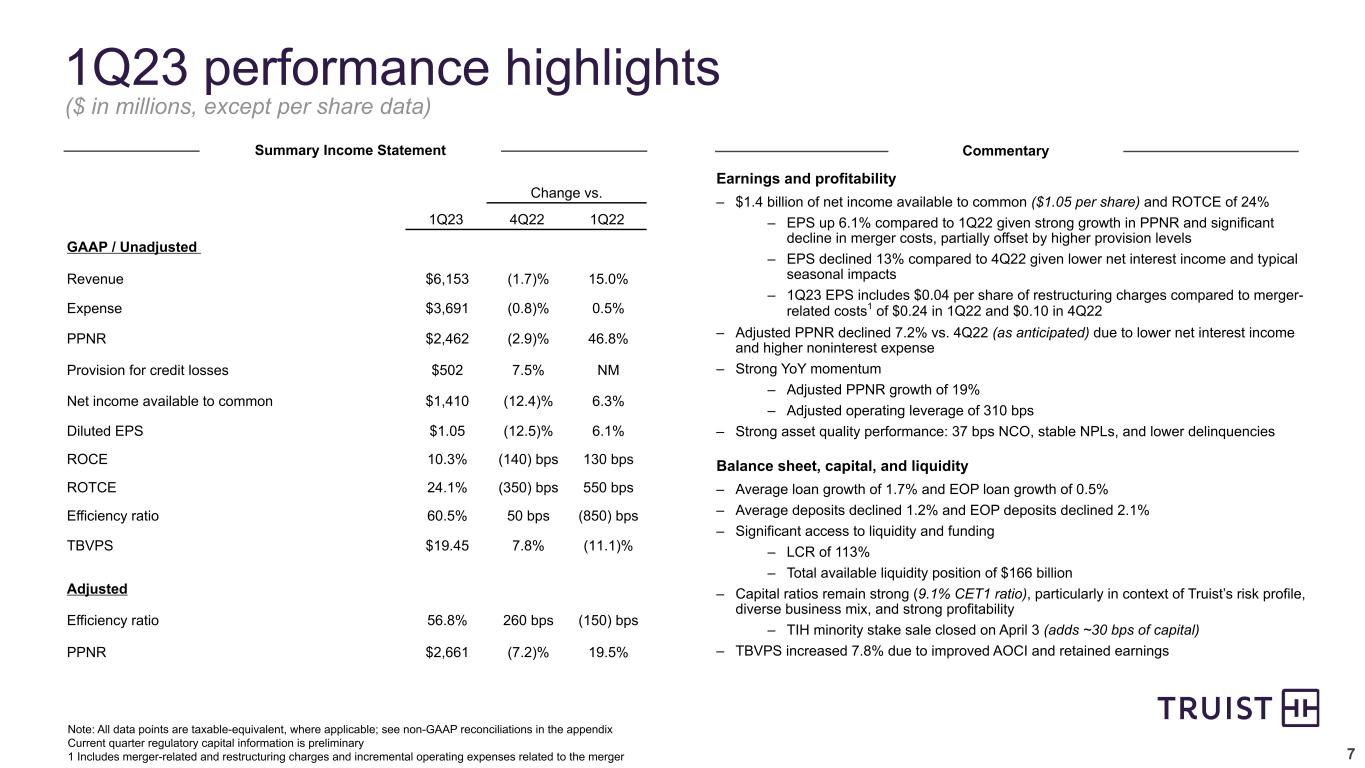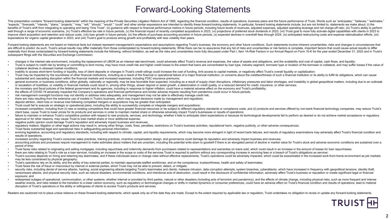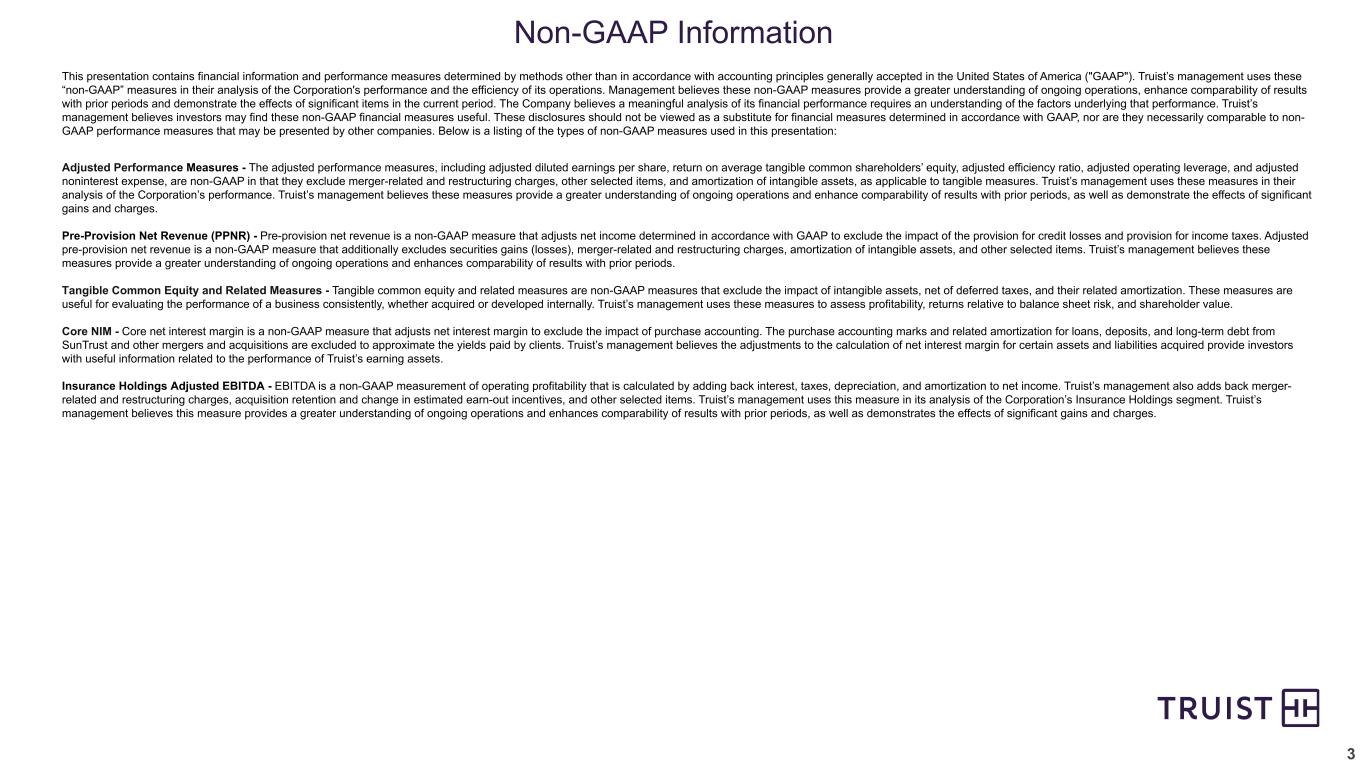 2 This presentation contains “forward-looking statements” within the meaning of the Private Securities Litigation Reform Act of 1995, regarding the financial condition, results of operations, business plans and the future performance of Truist. Words such as “anticipates,” “believes,” “estimates,” “expects,” “forecasts,” “intends,” “plans,” “projects,” “may,” “will,” “should,” “would,” “could” and other similar expressions are intended to identify these forward-looking statements. In particular, forward looking statements include, but are not limited to, statements we make about: (i) the benefits of Truist’s shift from integrating to operating and being “One Truist”, (ii) guidance with respect to financial performance metrics in future periods, including future levels of revenues, adjusted expenses, adjusted operating leverage and net charge-off ratio, (iii) Truist’s ability to perform well through a range of economic scenarios, (iv) Truist’s effective tax rate in future periods, (v) the financial impact of recently completed acquisitions in 2023, (vi) projections of preferred stock dividends in 2023, (vii) Truist goal to more fully activate digital capabilities with clients in 2023 to improve client acquisition and retention and reduce costs, (viii) loan growth in future periods, (ix) the effects of purchase accounting accretion in future periods, (x) expected declines in overdraft fees through 2024, (xi) anticipated restructuring costs and expense rationalization efforts, (xii) expectations for organic capital generation in 2023, and (xiii) Truist’s goal to produce strong growth and profitability with less volatility than peers. Forward-looking statements are not based on historical facts but instead represent management’s expectations and assumptions regarding Truist’s business, the economy and other future conditions. Such statements involve inherent uncertainties, risks and changes in circumstances that are difficult to predict. As such, Truist’s actual results may differ materially from those contemplated by forward-looking statements. While there can be no assurance that any list of risks and uncertainties or risk factors is complete, important factors that could cause actual results to differ materially from those contemplated by forward-looking statements include the following, without limitation, as well as the risks and uncertainties more fully discussed under Part I, Item 1A-Risk Factors in our Annual Report on Form 10-K for the year ended December 31, 2022 and in Truist’s subsequent filings with the Securities and Exchange Commission: • changes in the interest rate environment, including the replacement of LIBOR as an interest rate benchmark, could adversely affect Truist’s revenue and expenses, the value of assets and obligations, and the availability and cost of capital, cash flows, and liquidity; • Truist is subject to credit risk by lending or committing to lend money, may have more credit risk and higher credit losses to the extent that loans are concentrated by loan type, industry segment, borrower type or location of the borrower or collateral, and may suffer losses if the value of collateral declines in stressed market conditions; • inability to access short-term funding or liquidity, loss of client deposits or changes in Truist’s credit ratings could increase the cost of funding, limit access to capital markets, or negatively affect Truist’s overall liquidity or capitalization; • Truist may be impacted by the soundness of other financial institutions, including as a result of the financial or operational failure of a major financial institution, or concerns about the creditworthiness of such a financial institution or its ability to fulfill its obligations, which can cause substantial and cascading disruption within the financial markets and increased expenses, including FDIC insurance premiums; • general economic or business conditions, either globally, nationally or regionally, may be less favorable than expected, including as a result of supply chain disruptions, inflationary pressures and labor shortages, and instability in global geopolitical matters, including due to an outbreak or escalation of hostilities, or volatility in financial markets could result in, among other things, slower deposit or asset growth, a deterioration in credit quality, or a reduced demand for credit, insurance, or other services; • the monetary and fiscal policies of the federal government and its agencies, including in response to higher inflation, could have a material adverse effect on the economy and Truist’s profitability; • the effects of COVID-19 adversely impacted the Company’s operations and financial performance and similar adverse impacts resulting from pandemics could occur in future periods; • risk management oversight functions may not identify or address risks adequately, and management may not be able to effectively manage credit risk; • there are risks resulting from the extensive use of models in Truist’s business, which may impact decisions made by management and regulators; • deposit attrition, client loss or revenue loss following completed mergers or acquisitions may be greater than anticipated; • Truist could fail to execute on strategic or operational plans, including the ability to successfully complete or integrate mergers and acquisitions; • increased competition, including from (i) new or existing competitors that could have greater financial resources or be subject to different regulatory standards or compliance costs, and (ii) products and services offered by non-bank financial technology companies, may reduce Truist’s client base, cause Truist to lower prices for its products and services in order to maintain market share or otherwise adversely impact Truist’s businesses or results of operations; • failure to maintain or enhance Truist’