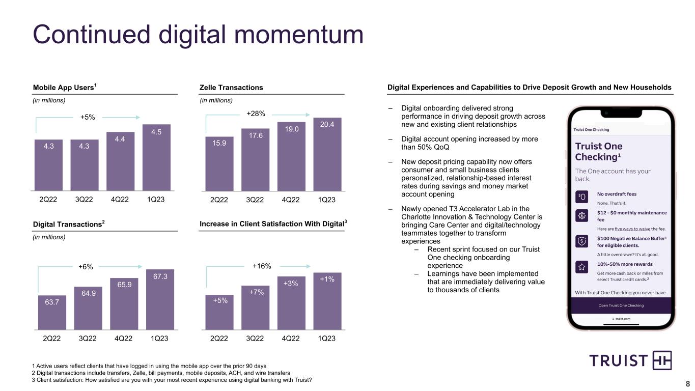 7 1Q23 performance highlights Earnings and profitability – $1.4 billion of net income available to common ($1.05 per share) and ROTCE of 24% – EPS up 6.1% compared to 1Q22 given strong growth in PPNR and significant decline in merger costs, partially offset by higher provision levels – EPS declined 13% compared to 4Q22 given lower net interest income and typical seasonal impacts – 1Q23 EPS includes $0.04 per share of restructuring charges compared to merger- related costs1 of $0.24 in 1Q22 and $0.10 in 4Q22 – Adjusted PPNR declined 7.2% vs. 4Q22 (as anticipated) due to lower net interest income and higher noninterest expense – Strong YoY momentum – Adjusted PPNR growth of 19% – Adjusted operating leverage of 310 bps – Strong asset quality performance: 37 bps NCO, stable NPLs, and lower delinquencies Balance sheet, capital, and liquidity – Average loan growth of 1.7% and EOP loan growth of 0.5% – Average deposits declined 1.2% and EOP deposits declined 2.1% – Significant access to liquidity and funding – LCR of 113% – Total available liquidity position of $166 billion – Capital ratios remain strong (9.1% CET1 ratio), particularly in context of Truist’s risk profile, diverse business mix, and strong profitability – TIH minority stake sale closed on April 3 (adds ~30 bps of capital) – TBVPS increased 7.8% due to improved AOCI and retained earnings Change vs. 1Q23 4Q22 1Q22 GAAP / Unadjusted Revenue $6,153 (1.7)% 15.0% Expense $3,691 (0.8)% 0.5% PPNR $2,462 (2.9)% 46.8% Provision for credit losses $502 7.5% NM Net income available to common $1,410 (12.4)% 6.3% Diluted EPS $1.05 (12.5)% 6.1% ROCE 10.3% (140) bps 130 bps ROTCE 24.1% (350) bps 550 bps Efficiency ratio 60.5% 50 bps (850) bps TBVPS $19.45 7.8% (11.1)% Adjusted Efficiency ratio 56.8% 260 bps (150) bps PPNR $2,661 (7.2)% 19.5% Note: All data points are taxable-equivalent, where applicable; see non-GAAP reconciliations in the appendix Current quarter regulatory capital information is preliminary 1 Includes merger-related and restructuring charges and incremental operating expenses related to the merger Summary Income Statement Commentary ($ in millions, except per share data)