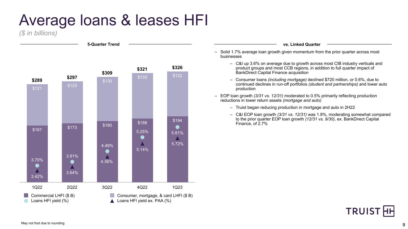 8 2Q22 3Q22 4Q22 1Q23 Digital Experiences and Capabilities to Drive Deposit Growth and New Households 2Q22 3Q22 4Q22 1Q23 Continued digital momentum 2Q22 3Q22 4Q22 1Q23 1 Active users reflect clients that have logged in using the mobile app over the prior 90 days 2 Digital transactions include transfers, Zelle, bill payments, mobile deposits, ACH, and wire transfers 3 Client satisfaction: How satisfied are you with your most recent experience using digital banking with Truist? 4.3 Mobile App Users1 Zelle Transactions Digital Transactions2 Increase in Client Satisfaction With Digital3 2Q22 3Q22 4Q22 1Q23 63.7 64.9 15.9 – Digital onboarding delivered strong performance in driving deposit growth across new and existing client relationships – Digital account opening increased by more than 50% QoQ – New deposit pricing capability now offers consumer and small business clients personalized, relationship-based interest rates during savings and money market account opening – Newly opened T3 Accelerator Lab in the Charlotte Innovation & Technology Center is bringing Care Center and digital/technology teammates together to transform experiences – Recent sprint focused on our Truist One checking onboarding experience – Learnings have been implemented that are immediately delivering value to thousands of clients 65.9 +5% +7% +3% 4.3 4.4 4.5 +5% 17.6 19.0 20.4 +28% 67.3 +6% +1% +16% (in millions) (in millions) (in millions)