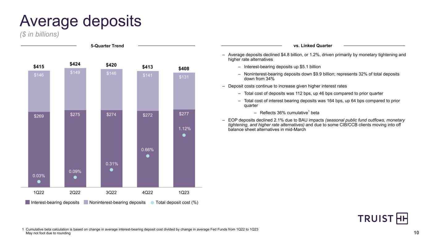 9 ($ in billions) $289 $297 $309 $321 $326 $167 $173 $180 $188 $194 $121 $123 $130 $133 $132 3.70% 3.91% 4.49% 5.25% 5.81% 3.42% 3.64% Commercial LHFI ($ B) Consumer, mortgage, & card LHFI ($ B) Loans HFI yield (%) Loans HFI yield ex. PAA (%) 1Q22 2Q22 3Q22 4Q22 1Q23 – Solid 1.7% average loan growth given momentum from the prior quarter across most businesses – C&I up 3.6% on average due to growth across most CIB industry verticals and product groups and most CCB regions, in addition to full quarter impact of BankDirect Capital Finance acquisition – Consumer loans (including mortgage) declined $720 million, or 0.6%, due to continued declines in run-off portfolios (student and partnerships) and lower auto production – EOP loan growth (3/31 vs. 12/31) moderated to 0.5% primarily reflecting production reductions in lower return assets (mortgage and auto) – Truist began reducing production in mortgage and auto in 2H22 – C&I EOP loan growth (3/31 vs. 12/31) was 1.8%, moderating somewhat compared to the prior quarter EOP loan growth (12/31 vs. 9/30), ex. BankDirect Capital Finance, of 2.7% Average loans & leases HFI 5-Quarter Trend vs. Linked Quarter 4.36% May not foot due to rounding 5.14% 5.72%