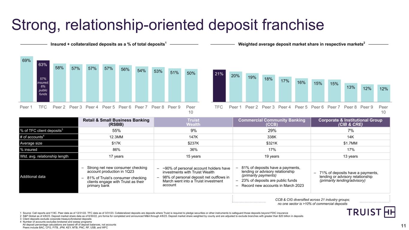 11 Strong, relationship-oriented deposit franchise Insured + collateralized deposits as a % of total deposits1 Weighted average deposit market share in respective markets2 69% 63% 58% 57% 57% 57% 56% 54% 53% 51% 50% Peer 1 TFC Peer 2 Peer 3 Peer 4 Peer 5 Peer 6 Peer 7 Peer 8 Peer 9 Peer 10 21% 20% 19% 18% 17% 16% 15% 15% 13% 12% 12% TFC Peer 1 Peer 2 Peer 3 Peer 4 Peer 5 Peer 6 Peer 7 Peer 8 Peer 9 Peer 10 1 Source: Call reports and Y-9C. Peer data as of 12/31/22. TFC data as of 3/31/23. Collateralized deposits are deposits where Truist is required to pledge securities or other instruments to safeguard those deposits beyond FDIC insurance 2 S&P Global as of 4/6/23. Deposit market share data as of 6/30/22, pro forma for completed and announced M&A through 4/6/23. Deposit market share weighted by county and are adjusted to exclude branches with greater than $20 billion in deposits 3 Client deposits exclude corporate treasury/brokered deposits 4 Number of accounts excludes brokered and sweep programs All deposit percentage calculations are based off of deposit balances, not accounts Peers include BAC, CFG, FITB, JPM, KEY, MTB, PNC, RF, USB, and WFC Retail & Small Business Banking (RSBB) Truist Wealth Commercial Community Banking (CCB) Corporate & Institutional Group (CIB & CRE) % of TFC client deposits3 55% 9% 29% 7% # of accounts4 12.3MM 147K 338K 14K Average size $17K $237K $321K $1.7MM % insured 86% 36% 17% 17% Wtd. avg. relationship length 17 years 15 years 19 years 13 years Additional data – Strong net new consumer checking account production in 1Q23 – 81% of Truist’s consumer checking clients engage with Truist as their primary bank – ~90% of personal account holders have investments with Truist Wealth – 98% of personal deposit net outflows in March went into a Truist investment account – 81% of deposits have a payments, lending or advisory relationship (primarily payments) – 23% of deposits are public funds – Record new accounts in March 2023 – 71% of deposits have a payments, lending or advisory relationship (primarily lending/advisory) CCB & CIG diversified across 21 industry groups; no one sector is >10% of commercial deposits 57% insured; 6% public funds