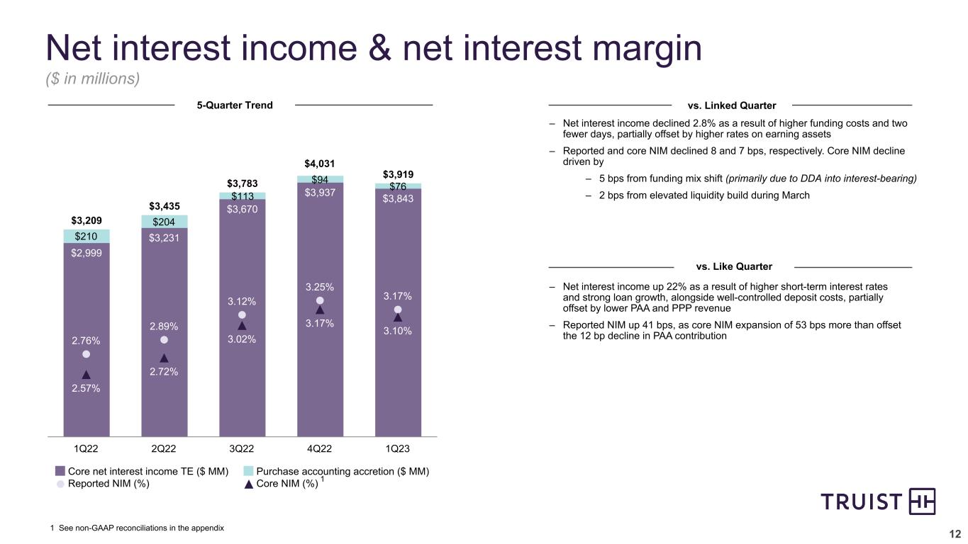A-12 Quarter Ended March 31 Dec. 31 Sept. 30 June 30 March 31 2023 2022 2022 2022 2022 Net interest income - GAAP $ 3,868 $ 3,981 $ 3,745 $ 3,407 $ 3,183 Taxable-equivalent adjustment 51 50 38 28 26 Net interest income - taxable-equivalent 3,919 4,031 3,783 3,435 3,209 Accretion of mark on acquired loans (64) (80) (96) (189) (191) Accretion of mark on acquired liabilities (12) (14) (17) (15) (19) Net interest income - core(1) $ 3,843 $ 3,937 $ 3,670 $ 3,231 $ 2,999 Average earning assets - GAAP $ 499,149 $ 492,805 $ 482,349 $ 475,818 $ 469,940 Average balance - mark on acquired loans 617 787 875 1,029 1,247 Average earning assets - core(1) $ 499,766 $ 493,592 $ 483,224 $ 476,847 $ 471,187 Annualized net interest margin: Reported - taxable-equivalent 3.17 % 3.25 % 3.12 % 2.89 % 2.76 % Core(1) 3.10 3.17 3.02 2.72 2.57 Non-GAAP reconciliations Core NIM ($ in millions) (1) Core net interest margin is a non-GAAP measure that adjusts net interest margin to exclude the impact of purchase accounting. The purchase accounting marks and related amortization for loans, deposits, and long-term debt from SunTrust and other mergers and acquisitions are excluded to approximate the yields paid by clients. Truist’s management believes the adjustments to the calculation of net interest margin for certain assets and liabilities acquired provide investors with useful information related to the performance of Truist’s earning assets. These measures are not necessarily comparable to similar measures that may be presented by other companies.
