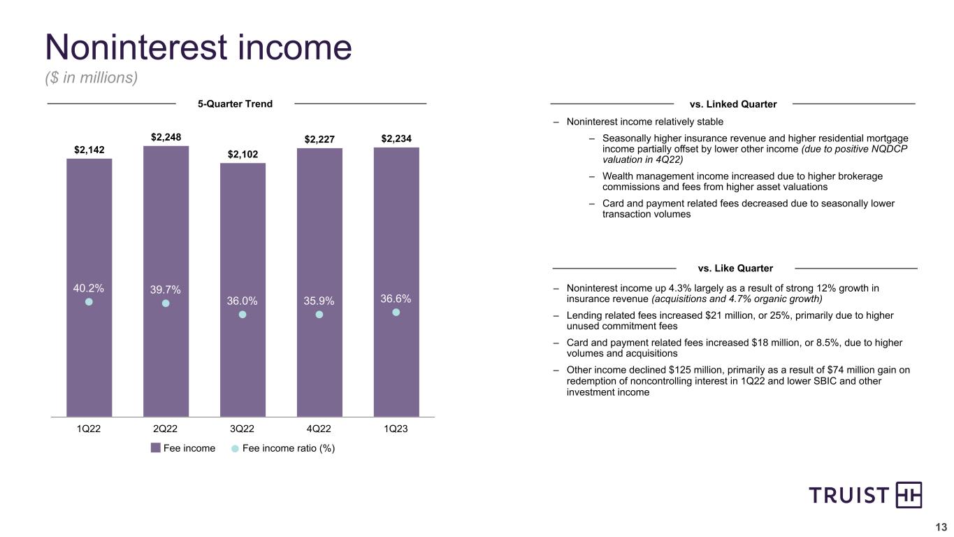 12 $3,209 $3,435 $3,783 $4,031 $3,919 $2,999 $3,231 $3,670 $3,937 $3,843 $210 $204 $113 $94 $76 2.76% 2.89% 3.12% 3.25% 3.17% 2.57% 2.72% 3.02% 3.17% 3.10% Core net interest income TE ($ MM) Purchase accounting accretion ($ MM) Reported NIM (%) Core NIM (%) 1Q22 2Q22 3Q22 4Q22 1Q23 Net interest income & net interest margin 1 See non-GAAP reconciliations in the appendix vs. Linked Quarter5-Quarter Trend 1 – Net interest income declined 2.8% as a result of higher funding costs and two fewer days, partially offset by higher rates on earning assets – Reported and core NIM declined 8 and 7 bps, respectively. Core NIM decline driven by – 5 bps from funding mix shift (primarily due to DDA into interest-bearing) – 2 bps from elevated liquidity build during March vs. Like Quarter – Net interest income up 22% as a result of higher short-term interest rates and strong loan growth, alongside well-controlled deposit costs, partially offset by lower PAA and PPP revenue – Reported NIM up 41 bps, as core NIM expansion of 53 bps more than offset the 12 bp decline in PAA contribution $4,031 ($ in millions)