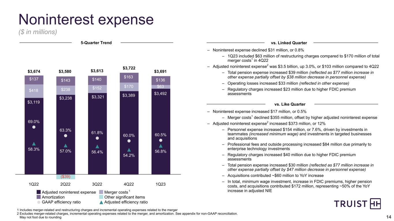 13 $2,142 $2,248 $2,102 $2,227 $2,234 40.2% 39.7% 36.0% 35.9% 36.6% Fee income Fee income ratio (%) 1Q22 2Q22 3Q22 4Q22 1Q23 Noninterest income vs. Linked Quarter5-Quarter Trend – Noninterest income relatively stable – Seasonally higher insurance revenue and higher residential mortgage income partially offset by lower other income (due to positive NQDCP valuation in 4Q22) – Wealth management income increased due to higher brokerage commissions and fees from higher asset valuations – Card and payment related fees decreased due to seasonally lower transaction volumes vs. Like Quarter – Noninterest income up 4.3% largely as a result of strong 12% growth in insurance revenue (acquisitions and 4.7% organic growth) – Lending related fees increased $21 million, or 25%, primarily due to higher unused commitment fees – Card and payment related fees increased $18 million, or 8.5%, due to higher volumes and acquisitions – Other income declined $125 million, primarily as a result of $74 million gain on redemption of noncontrolling interest in 1Q22 and lower SBIC and other investment income ($ in millions)