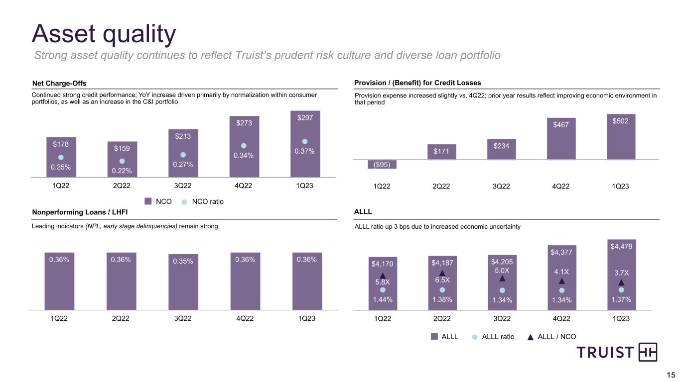 14 – Noninterest expense increased $17 million, or 0.5% – Merger costs1 declined $355 million, offset by higher adjusted noninterest expense – Adjusted noninterest expense2 increased $373 million, or 12% – Personnel expense increased $154 million, or 7.6%, driven by investments in teammates (increased minimum wage) and investments in targeted businesses and acquisitions – Professional fees and outside processing increased $84 million due primarily to enterprise technology investments – Regulatory charges increased $40 million due to higher FDIC premium assessments – Total pension expense increased $30 million (reflected as $77 million increase in other expense partially offset by $47 million decrease in personnel expense) – Acquisitions contributed ~$60 million to YoY increase – In total, minimum wage investment, increase in FDIC premiums, higher pension costs, and acquisitions contributed $172 million, representing ~50% of the YoY increase in adjusted NIE 69.0% 63.3% 61.8% 60.0% 60.5% 58.3% 57.0% 56.4% 54.2% 56.8% Adjusted noninterest expense Merger costs Amortization Other significant items GAAP efficiency ratio Adjusted efficiency ratio 1Q22 2Q22 3Q22 4Q22 1Q23 1 Includes merger-related and restructuring charges and incremental operating expenses related to the merger 2 Excludes merger-related charges, incremental operating expenses related to the merger, and amortization. See appendix for non-GAAP reconciliation. May not foot due to rounding Noninterest expense $137 $418 $3,119 $3,674 $152 $3,238 $3,580 ($39) 1 $3,613 vs. Linked Quarter5-Quarter Trend – Noninterest expense declined $31 million, or 0.8% – 1Q23 included $63 million of restructuring charges compared to $170 million of total merger costs1 in 4Q22 – Adjusted noninterest expense2 was $3.5 billion, up 3.0%, or $103 million compared to 4Q22 – Total pension expense increased $39 million (reflected as $77 million increase in other expense partially offset by $38 million decrease in personnel expense) – Operating losses increased $33 million (reflected in other expense) – Regulatory charges increased $23 million due to higher FDIC premium assessments vs. Like Quarter $238 $3,321 $140 $3,389 $170 $163 $3,722 $143 $3,492 $63 $163$3,691 $136 ($ in millions)