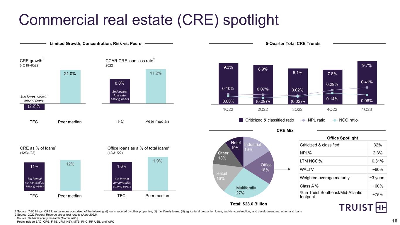 15 $178 $159 $213 $273 $297 0.25% 0.22% 0.27% 0.34% 0.37% NCO NCO ratio 1Q22 2Q22 3Q22 4Q22 1Q23 Asset quality 4.5x 9.0x 8.8x $421Net Charge-Offs Provision / (Benefit) for Credit Losses Nonperforming Loans / LHFI ALLL ($95) $171 $234 $467 $502 1Q22 2Q22 3Q22 4Q22 1Q23 $4,170 $4,187 $4,205 $4,377 $4,479 1.44% 1.38% 1.34% 1.34% 1.37% ALLL ALLL ratio ALLL / NCO 1Q22 2Q22 3Q22 4Q22 1Q23 Continued strong credit performance; YoY increase driven primarily by normalization within consumer portfolios, as well as an increase in the C&I portfolio Provision expense increased slightly vs. 4Q22; prior year results reflect improving economic environment in that period ALLL ratio up 3 bps due to increased economic uncertainty Strong asset quality continues to reflect Truist’s prudent risk culture and diverse loan portfolio Leading indicators (NPL, early stage delinquencies) remain strong 5.8X 6.5X 5.0X 0.36% 0.36% 0.35% 0.36% 0.36% 1Q22 2Q22 3Q22 4Q22 1Q23 3.7X4.1X