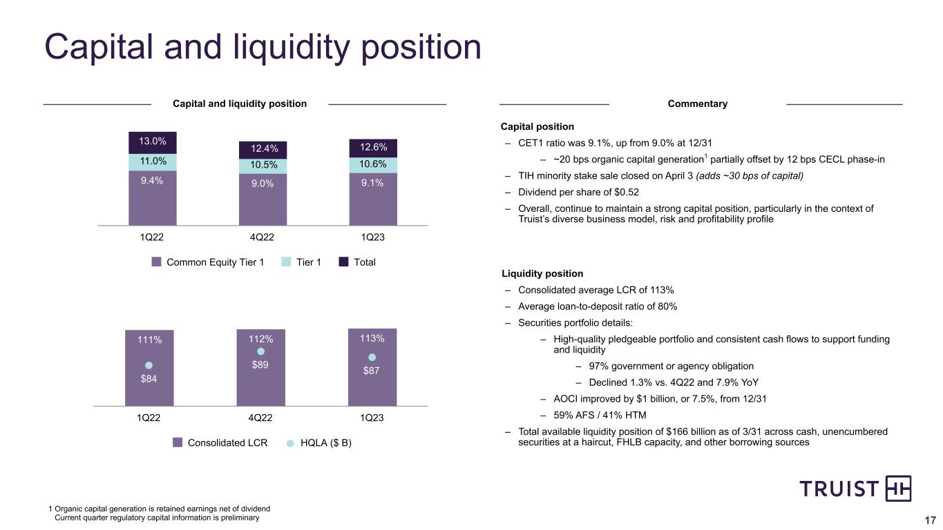 16 Industrial 16% Office 18% Multifamily 27% Retail 16% Other 13% Hotel 10% 8.0% 11.2% TFC Peer median 11% 12% TFC Peer median Commercial real estate (CRE) spotlight Limited Growth, Concentration, Risk vs. Peers 4.36% CRE growth1 (4Q19-4Q22) (2.2)% 13.1% TFC Peer median CRE as % of loans1 (12/31/22) CCAR CRE loan loss rate2 2022 1.6% 1.9% TFC Peer median Office loans as a % of total loans3 (12/31/22) 5-Quarter Total CRE Trends Criticized & classified 32% NPL% 2.3% LTM NCO% 0.31% WALTV ~60% Weighted average maturity ~3 years Class A % ~60% % in Truist Southeast/Mid-Atlantic footprint ~75% TFC Peer median Office Spotlight Total: $28.6 Billion CRE Mix 1 Source: Y-9C filings; CRE loan balances comprised of the following: (i) loans secured by other properties, (ii) multifamily loans, (iii) agricultural production loans, and (iv) construction, land development and other land loans 2 Source: 2022 Federal Reserve stress test results (June 2022) 3 Source: Sell-side equity research (March 2023) Peers include BAC, CFG, FITB, JPM, KEY, MTB, PNC, RF, USB, and WFC 21.0 9.3% 8.9% 8.1% 7.8% 9.7% 0.10% 0.07% 0.02% 0.29% 0.41% 0.14% 0.06% Criticized & classified ratio NPL ratio NCO ratio 1Q22 2Q22 3Q22 4Q22 1Q23 0.00% (0.09)% (0.02)% 2nd lowest growth among peers 2nd lowest loss rate among peers 5th lowest concentration among peers 4th lowest concentration among peers