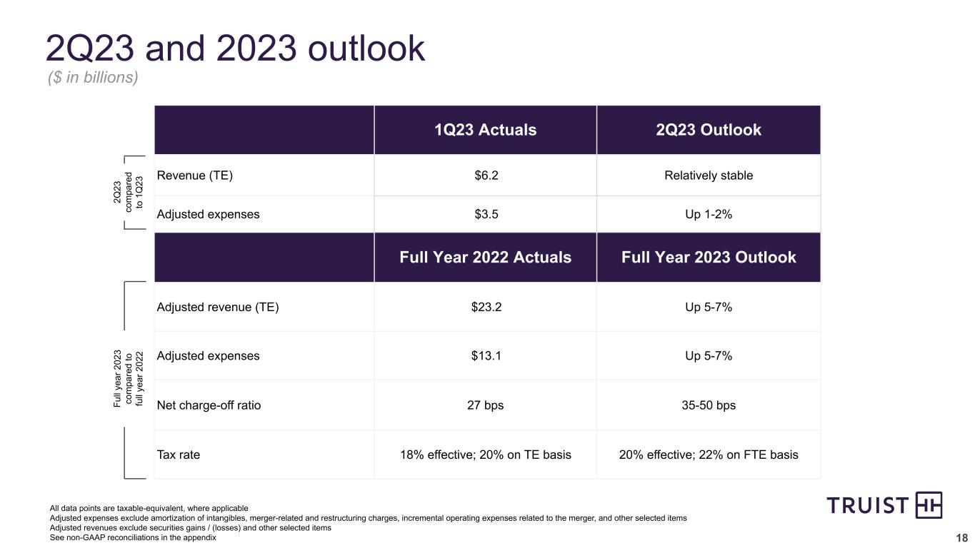 17 Capital and liquidity position 9.4% 9.0% 9.1% Common Equity Tier 1 Tier 1 Total 1Q22 4Q22 1Q23 1 Organic capital generation is retained earnings net of dividend Current quarter regulatory capital information is preliminary 111% 112% 113% $84 $89 $87 Consolidated LCR HQLA ($ B) 1Q22 4Q22 1Q23 12.6% Capital position – CET1 ratio was 9.1%, up from 9.0% at 12/31 – ~20 bps organic capital generation1 partially offset by 12 bps CECL phase-in – TIH minority stake sale closed on April 3 (adds ~30 bps of capital) – Dividend per share of $0.52 – Overall, continue to maintain a strong capital position, particularly in the context of Truist’s diverse business model, risk and profitability profile Liquidity position – Consolidated average LCR of 113% – Average loan-to-deposit ratio of 80% – Securities portfolio details: – High-quality pledgeable portfolio and consistent cash flows to support funding and liquidity – 97% government or agency obligation – Declined 1.3% vs. 4Q22 and 7.9% YoY – AOCI improved by $1 billion, or 7.5%, from 12/31 – 59% AFS / 41% HTM – Total available liquidity position of $166 billion as of 3/31 across cash, unencumbered securities at a haircut, FHLB capacity, and other borrowing sources 11.0% 13.0% Capital and liquidity position Commentary 10.5% 12.4% 10.6% 12.6%