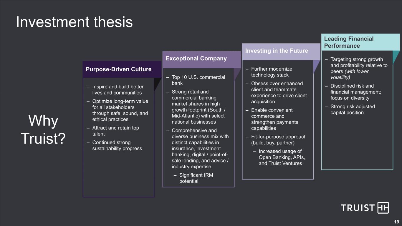 19 Investment thesis Why Truist? Purpose-Driven Culture Exceptional Company Investing in the Future Leading Financial Performance – Inspire and build better lives and communities – Optimize long-term value for all stakeholders through safe, sound, and ethical practices – Attract and retain top talent – Continued strong sustainability progress – Top 10 U.S. commercial bank – Strong retail and commercial banking market shares in high growth footprint (South / Mid-Atlantic) with select national businesses – Comprehensive and diverse business mix with distinct capabilities in insurance, investment banking, digital / point-of- sale lending, and advice / industry expertise – Significant IRM potential – Further modernize technology stack – Obsess over enhanced client and teammate experience to drive client acquisition – Enable convenient commerce and strengthen payments capabilities – Fit-for-purpose approach (build, buy, partner) – Increased usage of Open Banking, APIs, and Truist Ventures – Targeting strong growth and profitability relative to peers (with lower volatility) – Disciplined risk and financial management; focus on diversity – Strong risk adjusted capital position