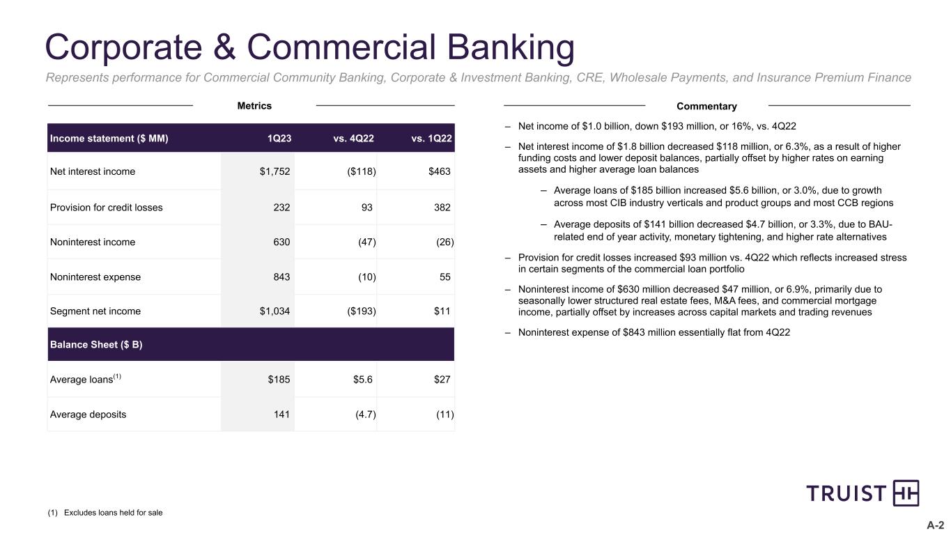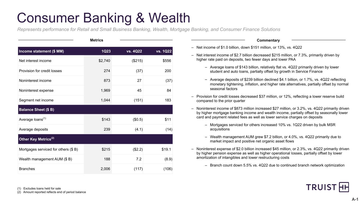 A-1 Consumer Banking & Wealth Income statement ($ MM) 1Q23 vs. 4Q22 vs. 1Q22 Net interest income $2,740 ($215) $556 Provision for credit losses 274 (37) 200 Noninterest income 873 27 (37) Noninterest expense 1,969 45 84 Segment net income 1,044 (151) 183 Balance Sheet ($ B) Average loans(1) $143 ($0.5) $11 Average deposits 239 (4.1) (14) Other Key Metrics(2) Mortgages serviced for others ($ B) $215 ($2.2) $19.1 Wealth management AUM ($ B) 188 7.2 (8.9) Branches 2,006 (117) (106) (1) Excludes loans held for sale (2) Amount reported reflects end of period balance Represents performance for Retail and Small Business Banking, Wealth, Mortgage Banking, and Consumer Finance Solutions – Net income of $1.0 billion, down $151 million, or 13%, vs. 4Q22 – Net interest income of $2.7 billion decreased $215 million, or 7.3%, primarily driven by higher rate paid on deposits, two fewer days and lower PAA – Average loans of $143 billion, relatively flat vs. 4Q22 primarily driven by lower student and auto loans, partially offset by growth in Service Finance – Average deposits of $239 billion declined $4.1 billion, or 1.7%, vs. 4Q22 reflecting monetary tightening, inflation, and higher rate alternatives, partially offset by normal seasonal factors – Provision for credit losses decreased $37 million, or 12%, reflecting a lower reserve build compared to the prior quarter – Noninterest income of $873 million increased $27 million, or 3.2%, vs. 4Q22 primarily driven by higher mortgage banking income and wealth income, partially offset by seasonally lower card and payment related fees as well as lower service charges on deposits – Mortgages serviced for others increased 10% vs. 1Q22 driven by bulk MSR acquisitions – Wealth management AUM grew $7.2 billion, or 4.0%, vs. 4Q22 primarily due to market impact and positive net organic asset flows – Noninterest expense of $2.0 billion increased $45 million, or 2.3%, vs. 4Q22 primarily driven by higher pension expense as well as higher operational losses, partially offset by lower amortization of intangibles and lower restructuring costs – Branch count down 5.5% vs. 4Q22 due to continued branch network optimization Metrics Commentary