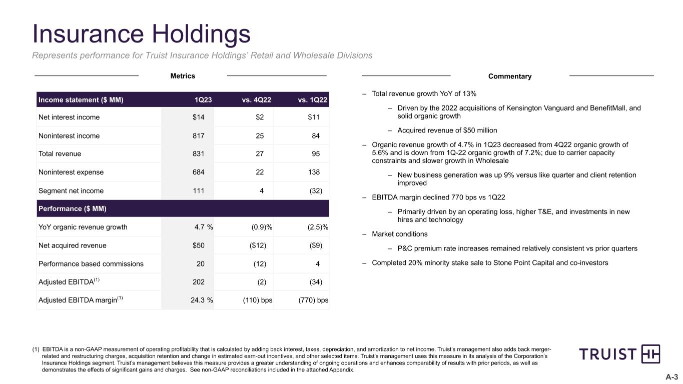 A-3 Insurance Holdings – Total revenue growth YoY of 13% – Driven by the 2022 acquisitions of Kensington Vanguard and BenefitMall, and solid organic growth – Acquired revenue of $50 million – Organic revenue growth of 4.7% in 1Q23 decreased from 4Q22 organic growth of 5.6% and is down from 1Q-22 organic growth of 7.2%; due to carrier capacity constraints and slower growth in Wholesale – New business generation was up 9% versus like quarter and client retention improved – EBITDA margin declined 770 bps vs 1Q22 – Primarily driven by an operating loss, higher T&E, and investments in new hires and technology – Market conditions – P&C premium rate increases remained relatively consistent vs prior quarters – Completed 20% minority stake sale to Stone Point Capital and co-investors (1) EBITDA is a non-GAAP measurement of operating profitability that is calculated by adding back interest, taxes, depreciation, and amortization to net income. Truist’s management also adds back merger- related and restructuring charges, acquisition retention and change in estimated earn-out incentives, and other selected items. Truist’s management uses this measure in its analysis of the Corporation’s Insurance Holdings segment. Truist’s management believes this measure provides a greater understanding of ongoing operations and enhances comparability of results with prior periods, as well as demonstrates the effects of significant gains and charges. See non-GAAP reconciliations included in the attached Appendix. Represents performance for Truist Insurance Holdings’ Retail and Wholesale Divisions Metrics Commentary Income statement ($ MM) 1Q23 vs. 4Q22 vs. 1Q22 Net interest income $14 $2 $11 Noninterest income 817 25 84 Total revenue 831 27 95 Noninterest expense 684 22 138 Segment net income 111 4 (32) Performance ($ MM) YoY organic revenue growth 4.7 % (0.9) % (2.5) % Net acquired revenue $50 ($12) ($9) Performance based commissions 20 (12) 4 Adjusted EBITDA(1) 202 (2) (34) Adjusted EBITDA margin(1) 24.3 % (110) bps (770) bps