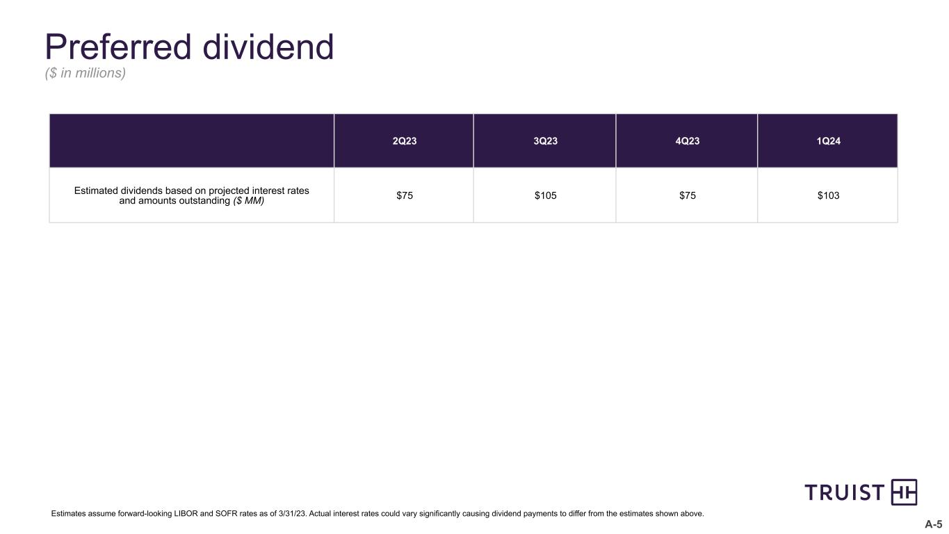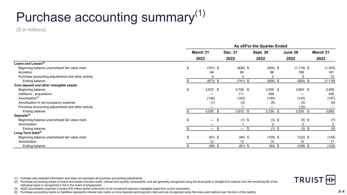 A-4 Purchase accounting summary(1) ($ in millions) As of/For the Quarter Ended March 31 Dec. 31 Sept. 30 June 30 March 31 2023 2022 2022 2022 2022 Loans and Leases(2) Beginning balance unamortized fair value mark $ (741) $ (826) $ (924) $ (1,119) $ (1,323) Accretion 64 80 96 189 191 Purchase accounting adjustments and other activity 4 5 2 6 13 Ending balance $ (673) $ (741) $ (826) $ (924) $ (1,119) Core deposit and other intangible assets Beginning balance $ 3,672 $ 3,726 $ 3,535 $ 3,693 $ 3,408 Additions - acquisitions — 111 336 — 430 Amortization(3) (136) (163) (140) (143) (137) Amortization in net occupancy expense (1) (3) (5) (5) (8) Purchase accounting adjustments and other activity — 1 — (10) — Ending balance $ 3,535 $ 3,672 $ 3,726 $ 3,535 $ 3,693 Deposits(4) Beginning balance unamortized fair value mark $ — $ (1) $ (3) $ (5) $ (7) Amortization — 1 2 2 2 Ending balance $ — $ — $ (1) $ (3) $ (5) Long-Term Debt(4) Beginning balance unamortized fair value mark $ (81) $ (94) $ (109) $ (122) $ (139) Amortization 12 13 15 13 17 Ending balance $ (69) $ (81) $ (94) $ (109) $ (122) (1) Includes only selected information and does not represent all purchase accounting adjustments. (2) Purchase accounting marks on loans and leases includes credit, interest and liquidity components, and are generally recognized using the level-yield or straight-line method over the remaining life of the individual loans or recognized in full in the event of prepayment. (3) 4Q22 amortization expense includes $16 million partial write-down of an investment advisory intangible asset from a prior acquisition. (4) Purchase accounting marks on liabilities represents interest rate marks on time deposits and long-term debt and are recognized using the level-yield method over the term of the liability.