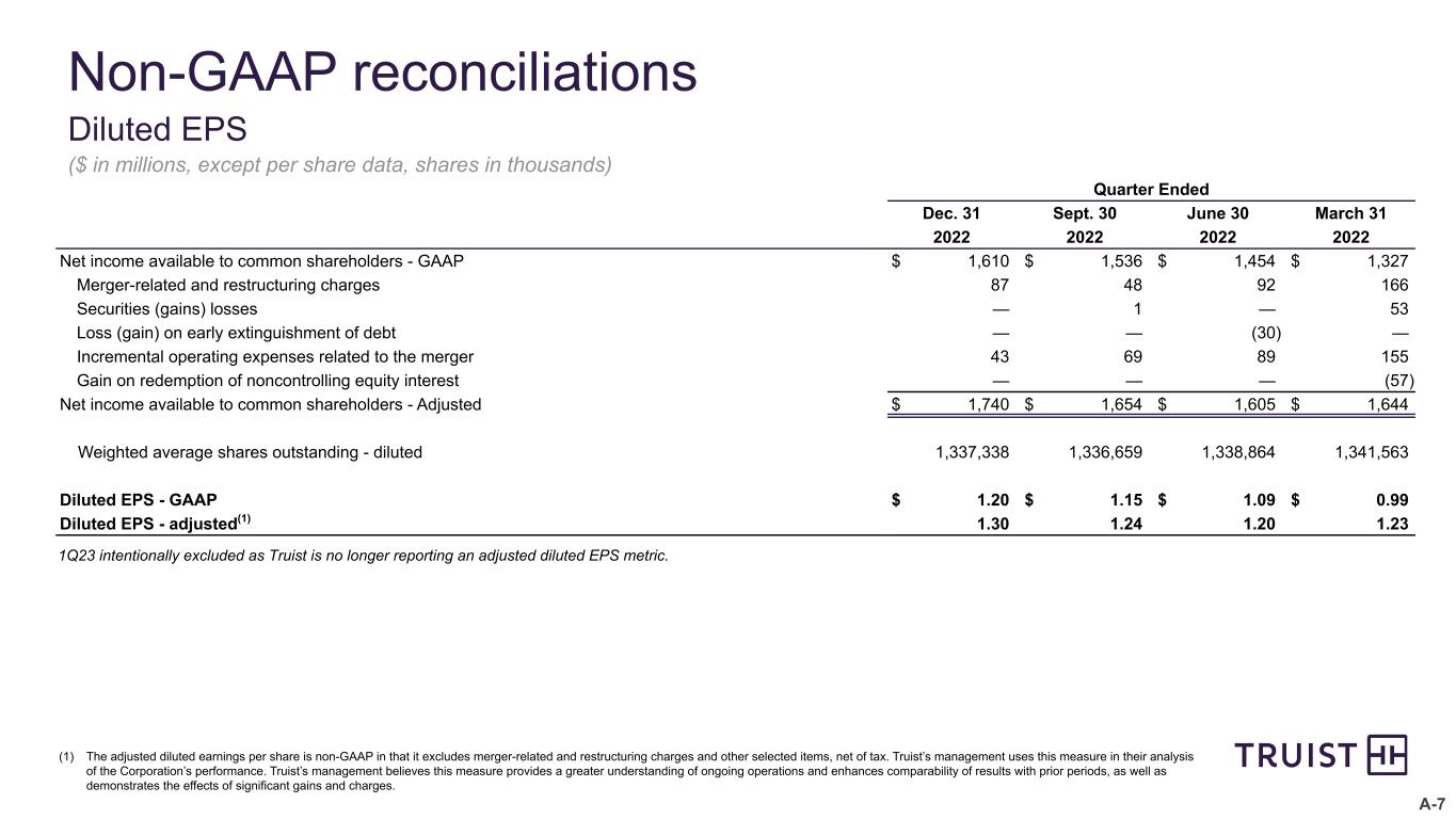 A-7 Quarter Ended Dec. 31 Sept. 30 June 30 March 31 2022 2022 2022 2022 Net income available to common shareholders - GAAP $ 1,610 $ 1,536 $ 1,454 $ 1,327 Merger-related and restructuring charges 87 48 92 166 Securities (gains) losses — 1 — 53 Loss (gain) on early extinguishment of debt — — (30) — Incremental operating expenses related to the merger 43 69 89 155 Gain on redemption of noncontrolling equity interest — — — (57) Net income available to common shareholders - Adjusted $ 1,740 $ 1,654 $ 1,605 $ 1,644 Weighted average shares outstanding - diluted 1,337,338 1,336,659 1,338,864 1,341,563 Diluted EPS - GAAP $ 1.20 $ 1.15 $ 1.09 $ 0.99 Diluted EPS - adjusted(1) 1.30 1.24 1.20 1.23 Non-GAAP reconciliations Diluted EPS ($ in millions, except per share data, shares in thousands) (1) The adjusted diluted earnings per share is non-GAAP in that it excludes merger-related and restructuring charges and other selected items, net of tax. Truist’s management uses this measure in their analysis of the Corporation’s performance. Truist’s management believes this measure provides a greater understanding of ongoing operations and enhances comparability of results with prior periods, as well as demonstrates the effects of significant gains and charges. 1Q23 intentionally excluded as Truist is no longer reporting an adjusted diluted EPS metric.