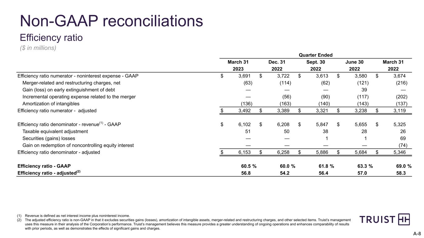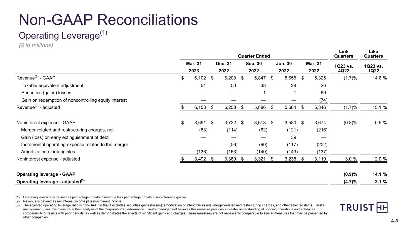 A-8 Non-GAAP reconciliations Efficiency ratio ($ in millions) (1) Revenue is defined as net interest income plus noninterest income. (2) The adjusted efficiency ratio is non-GAAP in that it excludes securities gains (losses), amortization of intangible assets, merger-related and restructuring charges, and other selected items. Truist’s management uses this measure in their analysis of the Corporation’s performance. Truist’s management believes this measure provides a greater understanding of ongoing operations and enhances comparability of results with prior periods, as well as demonstrates the effects of significant gains and charges. Quarter Ended March 31 Dec. 31 Sept. 30 June 30 March 31 2023 2022 2022 2022 2022 Efficiency ratio numerator - noninterest expense - GAAP $ 3,691 $ 3,722 $ 3,613 $ 3,580 $ 3,674 Merger-related and restructuring charges, net (63) (114) (62) (121) (216) Gain (loss) on early extinguishment of debt — — — 39 — Incremental operating expense related to the merger — (56) (90) (117) (202) Amortization of intangibles (136) (163) (140) (143) (137) Efficiency ratio numerator - adjusted $ 3,492 $ 3,389 $ 3,321 $ 3,238 $ 3,119 Efficiency ratio denominator - revenue(1) - GAAP $ 6,102 $ 6,208 $ 5,847 $ 5,655 $ 5,325 Taxable equivalent adjustment 51 50 38 28 26 Securities (gains) losses — — 1 1 69 Gain on redemption of noncontrolling equity interest — — — — (74) Efficiency ratio denominator - adjusted $ 6,153 $ 6,258 $ 5,886 $ 5,684 $ 5,346 Efficiency ratio - GAAP 60.5 % 60.0 % 61.8 % 63.3 % 69.0 % Efficiency ratio - adjusted(2) 56.8 54.2 56.4 57.0 58.3