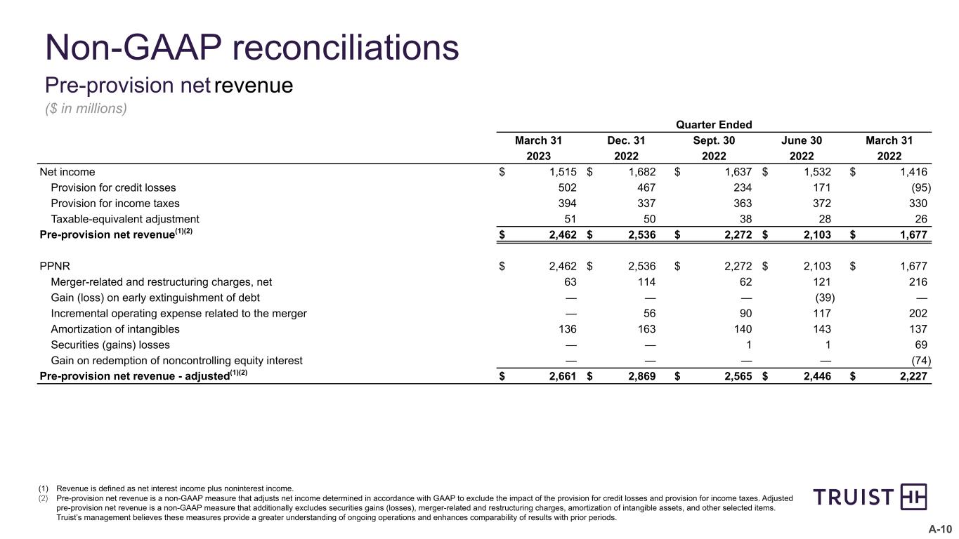 A-9 Non-GAAP Reconciliations Operating Leverage(1) ($ in millions) Quarter Ended Link Quarters Like Quarters Mar. 31 Dec. 31 Sep. 30 Jun. 30 Mar. 31 1Q23 vs. 4Q22 1Q23 vs. 1Q222023 2022 2022 2022 2022 Revenue(2) - GAAP $ 6,102 $ 6,208 $ 5,847 $ 5,655 $ 5,325 (1.7) % 14.6 % Taxable equivalent adjustment 51 50 38 28 26 Securities (gains) losses — — 1 1 69 Gain on redemption of noncontrolling equity interest — — — — (74) Revenue(2) - adjusted $ 6,153 $ 6,258 $ 5,886 $ 5,684 $ 5,346 (1.7) % 15.1 % Noninterest expense - GAAP $ 3,691 $ 3,722 $ 3,613 $ 3,580 $ 3,674 (0.8) % 0.5 % Merger-related and restructuring charges, net (63) (114) (62) (121) (216) Gain (loss) on early extinguishment of debt — — — 39 — Incremental operating expense related to the merger — (56) (90) (117) (202) Amortization of intangibles (136) (163) (140) (143) (137) Noninterest expense - adjusted $ 3,492 $ 3,389 $ 3,321 $ 3,238 $ 3,119 3.0 % 12.0 % Operating leverage - GAAP (0.9) % 14.1 % Operating leverage - adjusted(3) (4.7) % 3.1 % (1) Operating leverage is defined as percentage growth in revenue less percentage growth in noninterest expense. (2) Revenue is defined as net interest income plus noninterest income. (3) The adjusted operating leverage ratio is non-GAAP in that it excludes securities gains (losses), amortization of intangible assets, merger-related and restructuring charges, and other selected items. Truist’s management uses this measure in their analysis of the Corporation’s performance. Truist’s management believes this measure provides a greater understanding of ongoing operations and enhances comparability of results with prior periods, as well as demonstrates the effects of significant gains and charges. These measures are not necessarily comparable to similar measures that may be presented by other companies.