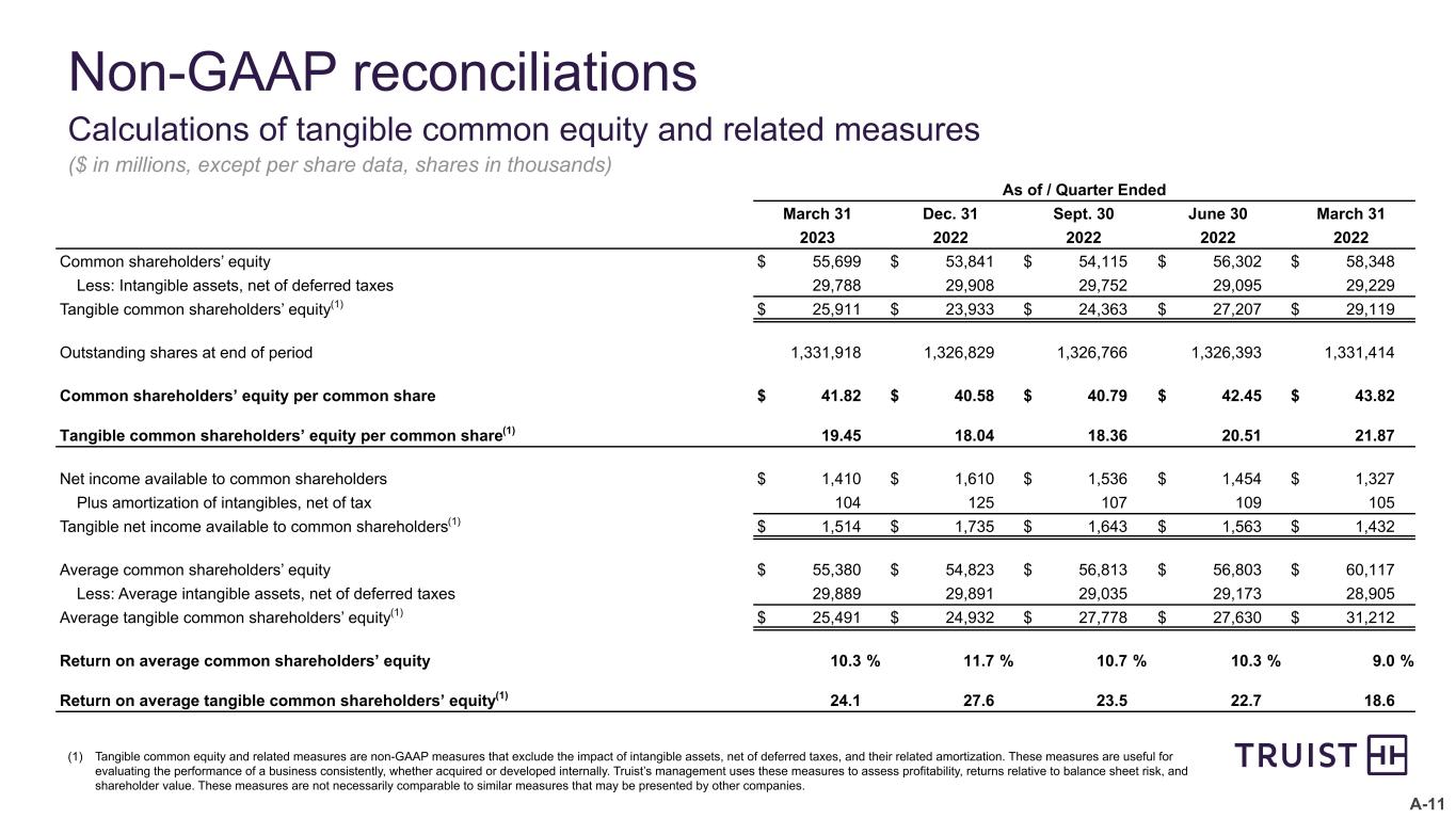 A-11 Non-GAAP reconciliations Calculations of tangible common equity and related measures ($ in millions, except per share data, shares in thousands) (1) Tangible common equity and related measures are non-GAAP measures that exclude the impact of intangible assets, net of deferred taxes, and their related amortization. These measures are useful for evaluating the performance of a business consistently, whether acquired or developed internally. Truist’s management uses these measures to assess profitability, returns relative to balance sheet risk, and shareholder value. These measures are not necessarily comparable to similar measures that may be presented by other companies. As of / Quarter Ended March 31 Dec. 31 Sept. 30 June 30 March 31 2023 2022 2022 2022 2022 Common shareholders’ equity $ 55,699 $ 53,841 $ 54,115 $ 56,302 $ 58,348 Less: Intangible assets, net of deferred taxes 29,788 29,908 29,752 29,095 29,229 Tangible common shareholders’ equity(1) $ 25,911 $ 23,933 $ 24,363 $ 27,207 $ 29,119 Outstanding shares at end of period 1,331,918 1,326,829 1,326,766 1,326,393 1,331,414 Common shareholders’ equity per common share $ 41.82 $ 40.58 $ 40.79 $ 42.45 $ 43.82 Tangible common shareholders’ equity per common share(1) 19.45 18.04 18.36 20.51 21.87 Net income available to common shareholders $ 1,410 $ 1,610 $ 1,536 $ 1,454 $ 1,327 Plus amortization of intangibles, net of tax 104 125 107 109 105 Tangible net income available to common shareholders(1) $ 1,514 $ 1,735 $ 1,643 $ 1,563 $ 1,432 Average common shareholders’ equity $ 55,380 $ 54,823 $ 56,813 $ 56,803 $ 60,117 Less: Average intangible assets, net of deferred taxes 29,889 29,891 29,035 29,173 28,905 Average tangible common shareholders’ equity(1) $ 25,491 $ 24,932 $ 27,778 $ 27,630 $ 31,212 Return on average common shareholders’ equity 10.3 % 11.7 % 10.7 % 10.3 % 9.0 % Return on average tangible common shareholders’ equity(1) 24.1 27.6 23.5 22.7 18.6