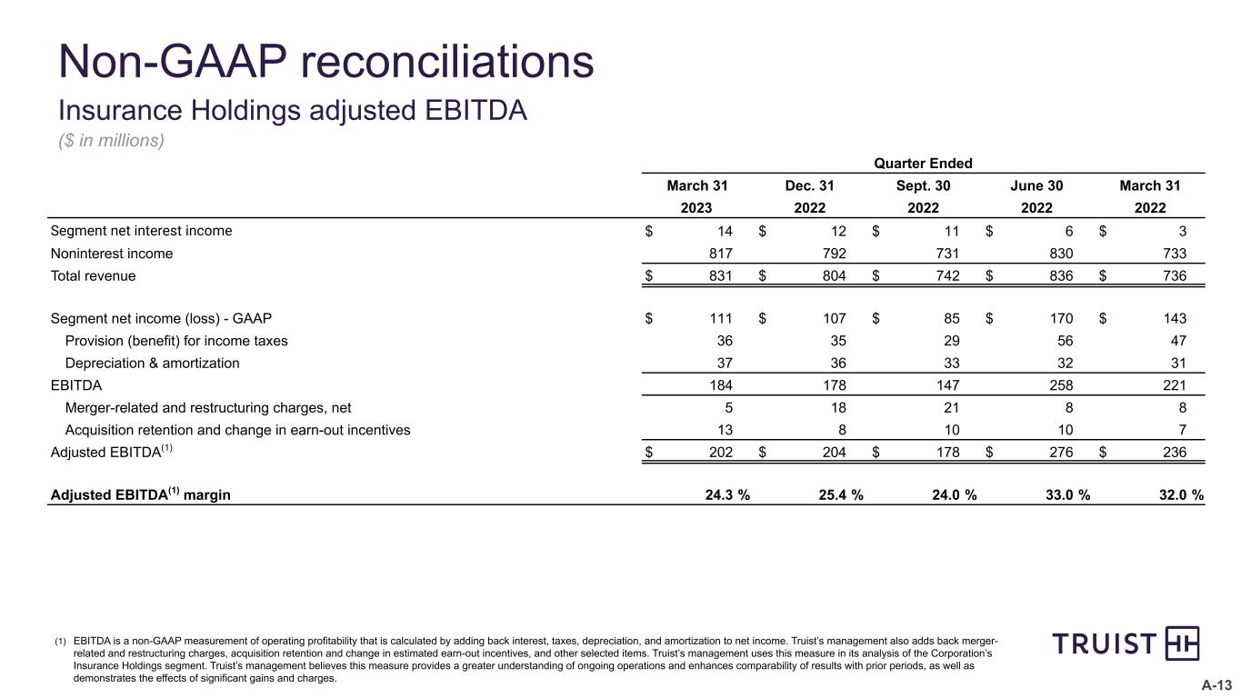 A-13 Non-GAAP reconciliations Insurance Holdings adjusted EBITDA ($ in millions) (1) EBITDA is a non-GAAP measurement of operating profitability that is calculated by adding back interest, taxes, depreciation, and amortization to net income. Truist’s management also adds back merger- related and restructuring charges, acquisition retention and change in estimated earn-out incentives, and other selected items. Truist’s management uses this measure in its analysis of the Corporation’s Insurance Holdings segment. Truist’s management believes this measure provides a greater understanding of ongoing operations and enhances comparability of results with prior periods, as well as demonstrates the effects of significant gains and charges. Quarter Ended March 31 Dec. 31 Sept. 30 June 30 March 31 2023 2022 2022 2022 2022 Segment net interest income $ 14 $ 12 $ 11 $ 6 $ 3 Noninterest income 817 792 731 830 733 Total revenue $ 831 $ 804 $ 742 $ 836 $ 736 Segment net income (loss) - GAAP $ 111 $ 107 $ 85 $ 170 $ 143 Provision (benefit) for income taxes 36 35 29 56 47 Depreciation & amortization 37 36 33 32 31 EBITDA 184 178 147 258 221 Merger-related and restructuring charges, net 5 18 21 8 8 Acquisition retention and change in earn-out incentives 13 8 10 10 7 Adjusted EBITDA(1) $ 202 $ 204 $ 178 $ 276 $ 236 Adjusted EBITDA(1) margin 24.3 % 25.4 % 24.0 % 33.0 % 32.0 %