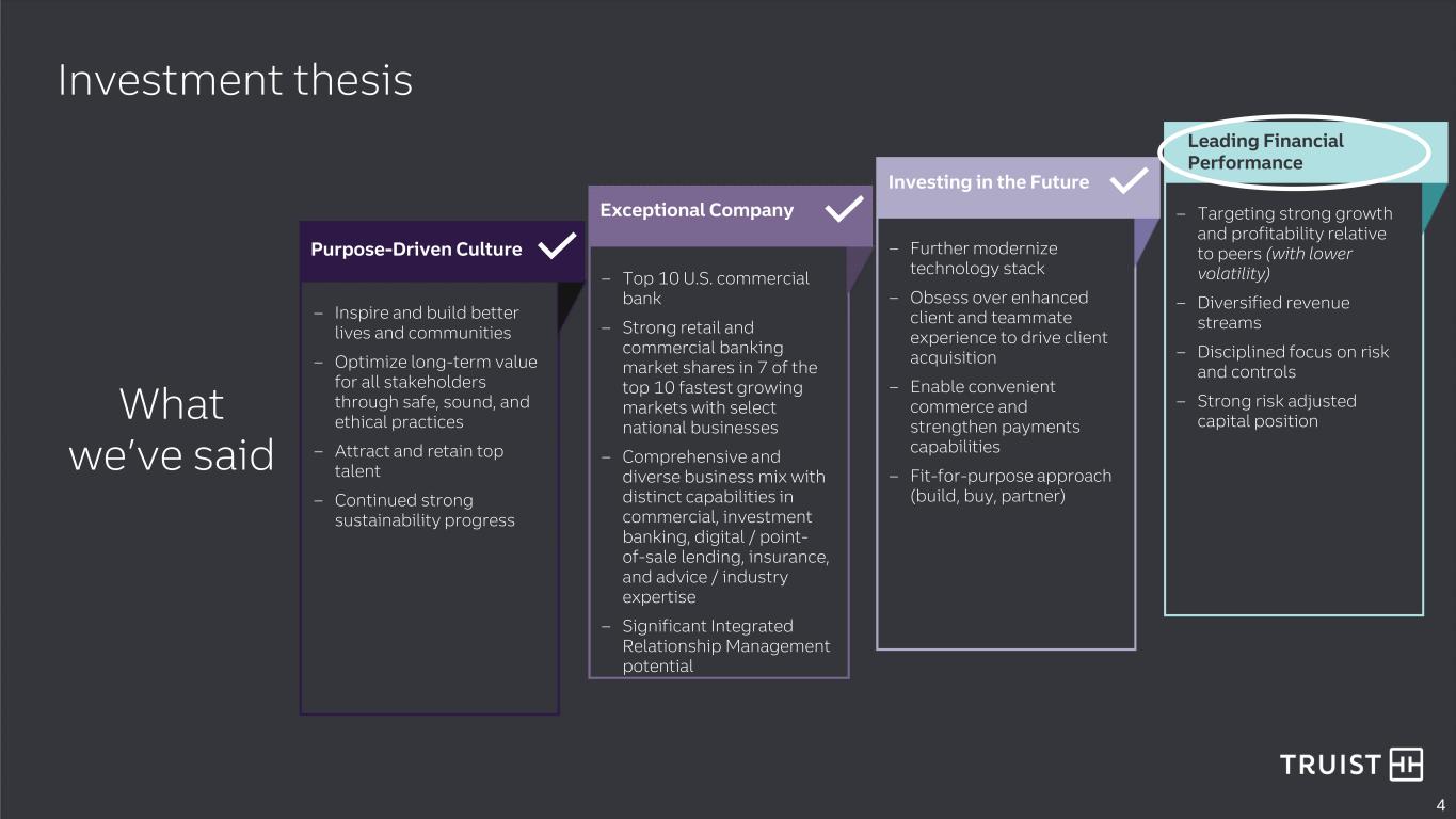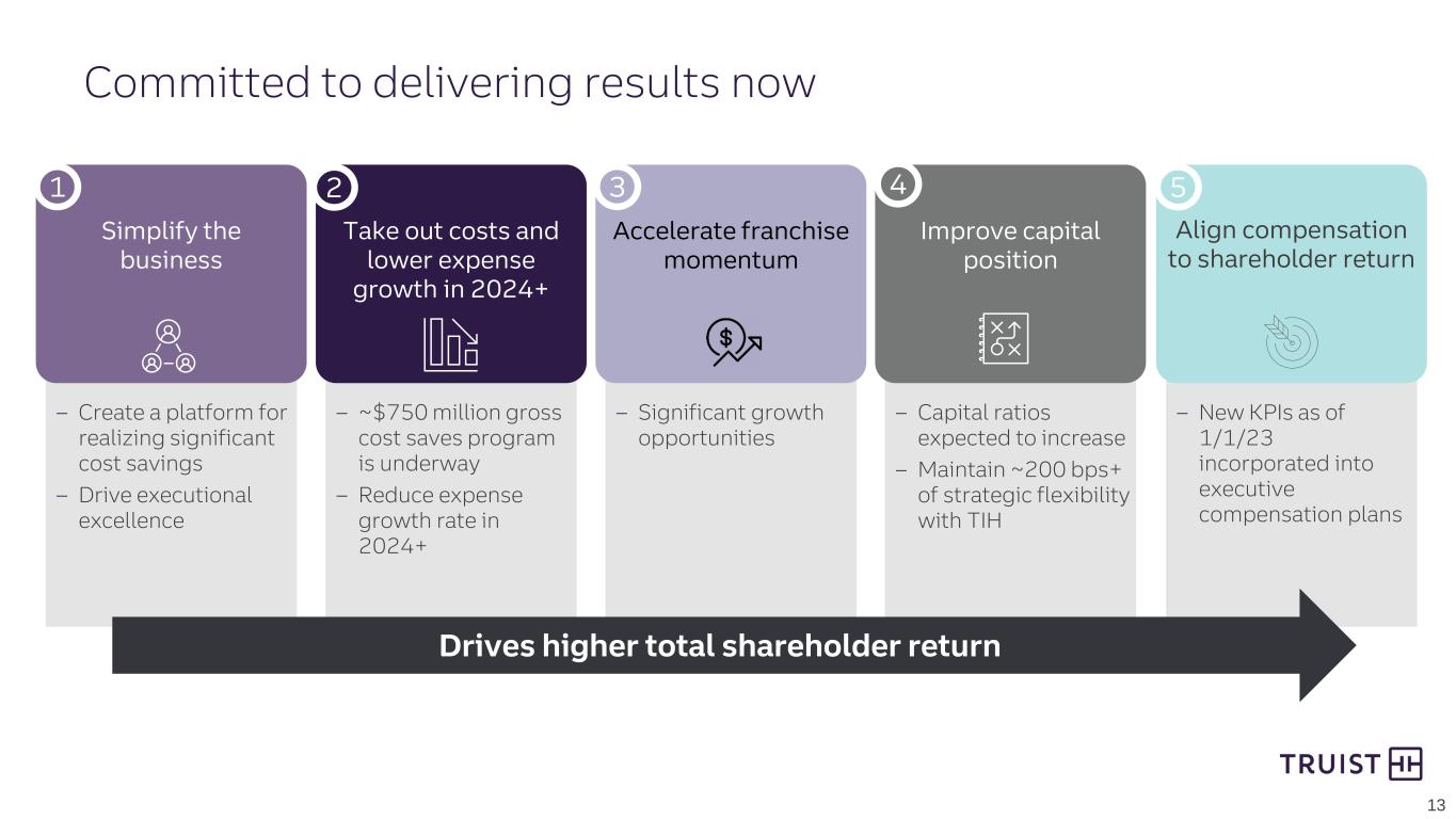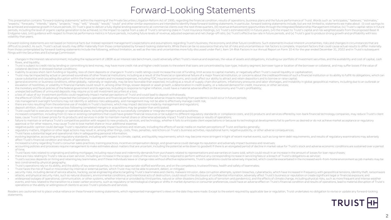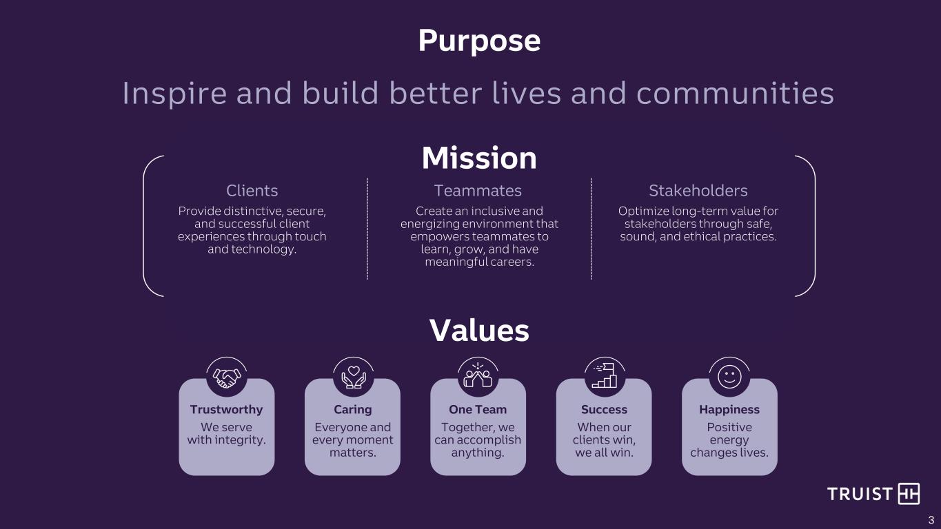 2 This presentation contains “forward-looking statements” within the meaning of the Private Securities Litigation Reform Act of 1995, regarding the financial condition, results of operations, business plans and the future performance of Truist. Words such as “anticipates,” “believes,” “estimates,” “expects,” “forecasts,” “intends,” “plans,” “projects,” “may,” “will,” “should,” “would,” “could” and other similar expressions are intended to identify these forward-looking statements. In particular, forward looking statements include, but are not limited to, statements we make about: (i) cost savings to be achieved and expense growth in future periods, (ii) Trust’s goal to deliver a fully digital lending experience to all commercial clients over the next three quarters, (iii) revenue enhancement opportunities through the Integrated Relationship Management initiative, (iv) Truist’s capital ratios in future periods, including the level of organic capital generation to be achieved, (v) the impact to capital from a sale of Truist’s remaining stake in Truist Insurance Holdings, (vi) Truist’s estimated AOCI in future years, (vii) the impact to Truist’s capital and risk weighted assets from the proposed Basel III Endgame rules, (viii) guidance with respect to financial performance metrics in future periods, including future levels of revenue, adjusted expenses and net charge-off ratio, (ix) Truist’s effective tax rate in future periods, and (x) Truist’s goal to produce strong growth and profitability with less volatility than peers. Forward-looking statements are not based on historical facts but instead represent management’s expectations and assumptions regarding Truist’s business, the economy and other future conditions. Such statements involve inherent uncertainties, risks and changes in circumstances that are difficult to predict. As such, Truist’s actual results may differ materially from those contemplated by forward-looking statements. While there can be no assurance that any list of risks and uncertainties or risk factors is complete, important factors that could cause actual results to differ materially from those contemplated by forward-looking statements include the following, without limitation, as well as the risks and uncertainties more fully discussed under Part I, Item 1A-Risk Factors in our Annual Report on Form 10-K for the year ended December 31, 2022 and in Truist’s subsequent filings with the Securities and Exchange Commission: • changes in the interest rate environment, including the replacement of LIBOR as an interest rate benchmark, could adversely affect Truist’s revenue and expenses, the value of assets and obligations, including our portfolio of investment securities, and the availability and cost of capital, cash flows, and liquidity; • Truist is subject to credit risk by lending or committing to lend money, may have more credit risk and higher credit losses to the extent that loans are concentrated by loan type, industry segment, borrower type or location of the borrower or collateral, and may suffer losses if the value of collateral declines in stressed market conditions; • inability to access short-term funding or liquidity, loss of client deposits or changes in Truist’s credit ratings could increase the cost of funding, limit access to capital markets, or negatively affect Truist’s overall liquidity or capitalization; • Truist may be impacted by actual or perceived soundness of other financial institutions, including as a result of the financial or operational failure of a major financial institution, or concerns about the creditworthiness of such a financial institution or its ability to fulfill its obligations, which can cause substantial and cascading disruption within the financial markets and increased expenses, including FDIC insurance premiums, and could affect our ability to attract and retain depositors and to borrow or raise capital; • general economic or business conditions, either globally, nationally or regionally, may be less favorable than expected, including as a result of supply chain disruptions, inflationary pressures and labor shortages, and instability in global geopolitical matters, including due to an outbreak or escalation of hostilities, or volatility in financial markets could result in, among other things, slower deposit or asset growth, a deterioration in credit quality, or a reduced demand for credit, insurance, or other services; • the monetary and fiscal policies of the federal government and its agencies, including in response to higher inflation, could have a material adverse effect on the economy and Truist’s profitability; • unexpected outflows of uninsured deposits may require us to sell investment securities at a loss; • a loss of value of our investment portfolio could negatively impact market perceptions of Truist and could lead to deposit withdrawals; • the effects of COVID-19 adversely impacted the Company’s operations and financial performance and similar adverse impacts resulting from pandemics could occur in future periods; • risk management oversight functions may not identify or address risks adequately, and management may not be able to effectively manage credit risk; • there are risks resulting from the extensive use of models in Truist’s business, which may impact decisions made by management and regulators; • deposit attrition, client loss or revenue loss following completed mergers or acquisitions may be greater than anticipated; • Truist could fail to execute on strategic or operational plans, including the ability to successfully complete or integrate mergers and acquisitions; • increased competition, including from (i) new or existing competitors that could have greater financial resources or be subject to different regulatory standards or compliance costs, and (ii) products and services offered b