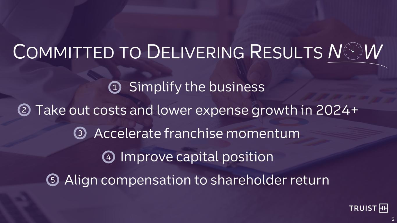 4 Investment thesis What we’ve said Purpose-Driven Culture Exceptional Company Investing in the Future – Inspire and build better lives and communities – Optimize long-term value for all stakeholders through safe, sound, and ethical practices – Attract and retain top talent – Continued strong sustainability progress – Top 10 U.S. commercial bank – Strong retail and commercial banking market shares in 7 of the top 10 fastest growing markets with select national businesses – Comprehensive and diverse business mix with distinct capabilities in commercial, investment banking, digital / point- of-sale lending, insurance, and advice / industry expertise – Significant Integrated Relationship Management potential – Further modernize technology stack – Obsess over enhanced client and teammate experience to drive client acquisition – Enable convenient commerce and strengthen payments capabilities – Fit-for-purpose approach (build, buy, partner) – Targeting strong growth and profitability relative to peers (with lower volatility) – Diversified revenue streams – Disciplined focus on risk and controls – Strong risk adjusted capital position Leading Financial Performance