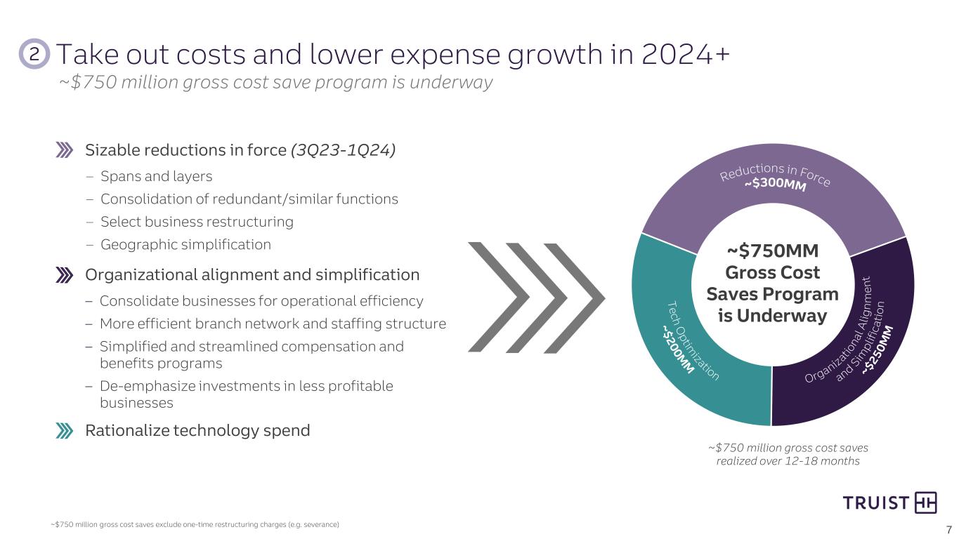 6 Benefits of Simplification Drive efficiency Greater accountability and focus Enhance revenue opportunities Portfolio optimization and rationalization Resource allocation Reduce risk and improve control function Fewer Layers of Management Leadership Structure at Merger Close (4Q19) Leadership Structure (4Q23E) 1 Simplify the business Streamlining will enhance our focus, drive efficiency, and lay the foundation for cost saves