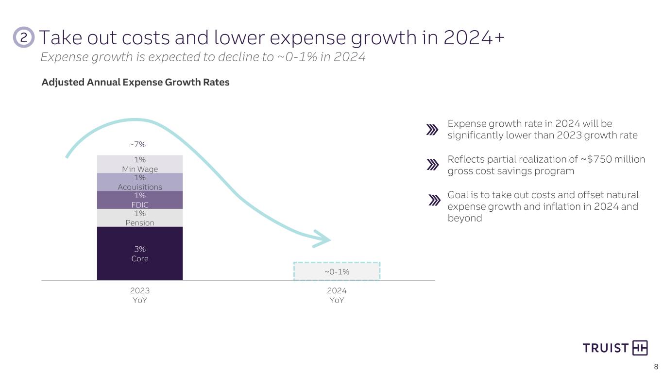 ~$750MM Gross Cost Saves Program is Underway ~$750 million gross cost save program is underway ~$750 million gross cost saves exclude one-time restructuring charges (e.g. severance) Sizable reductions in force (3Q23-1Q24) Organizational alignment and simplification Rationalize technology spend 7 – Spans and layers – Consolidation of redundant/similar functions – Select business restructuring – Geographic simplification ~$750 million gross cost saves realized over 12-18 months – Consolidate businesses for operational efficiency – More efficient branch network and staffing structure – Simplified and streamlined compensation and benefits programs – De-emphasize investments in less profitable businesses 2 Take out costs and lower expense growth in 2024+