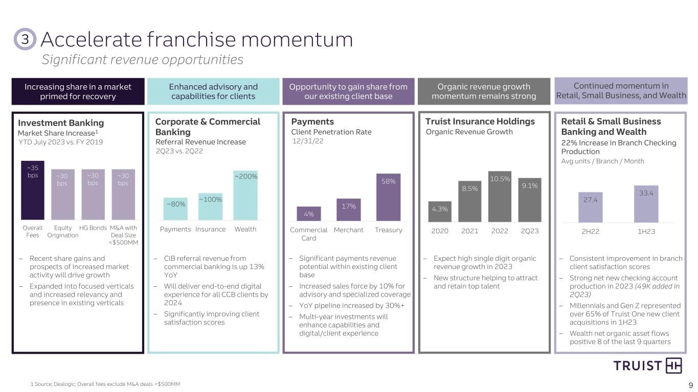 Adjusted Annual Expense Growth Rates 8 3% Core 1% Pension 1% FDIC 1% Acquisitions 1% Min Wage ~0-1% 2023 YoY 2024 YoY ~7% Expense growth rate in 2024 will be significantly lower than 2023 growth rate Reflects partial realization of ~$750 million gross cost savings program Goal is to take out costs and offset natural expense growth and inflation in 2024 and beyond 2 Take out costs and lower expense growth in 2024+ Expense growth is expected to decline to ~0-1% in 2024