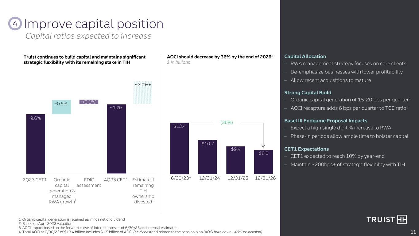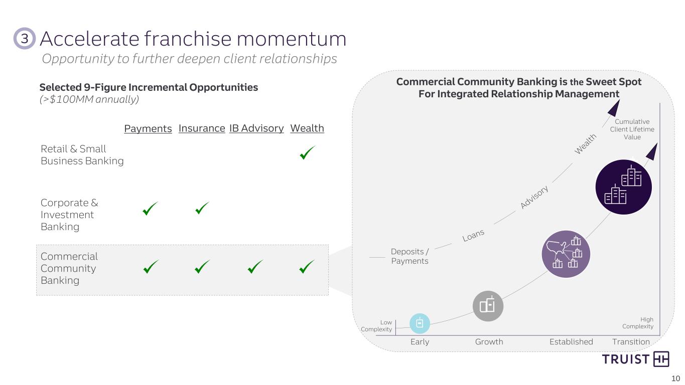Corporate & Commercial Banking Payments 4% 17% 58% Commercial Card Merchant Treasury – Significant payments revenue potential within existing client base – Increased sales force by 10% for advisory and specialized coverage – YoY pipeline increased by 30%+ – Multi-year investments will enhance capabilities and digital/client experience Client Penetration Rate – CIB referral revenue from commercial banking is up 13% YoY – Will deliver end-to-end digital experience for all CCB clients by 2024 – Significantly improving client satisfaction scores ~80% ~100% ~200% Payments Insurance Wealth Referral Revenue Increase Investment Banking – Consistent improvement in branch client satisfaction scores – Strong net new checking account production in 2023 (49K added in 2Q23) – Millennials and Gen Z represented over 65% of Truist One new client acquisitions in 1H23 – Wealth net organic asset flows positive 8 of the last 9 quarters Retail & Small Business Banking and Wealth 22% Increase in Branch Checking Production 9 Increasing share in a market primed for recovery Enhanced advisory and capabilities for clients Opportunity to gain share from our existing client base 27.4 33.4 2H22 1H23 Avg units / Branch / Month Significant revenue opportunities 3 Accelerate franchise momentum 2Q23 vs. 2Q22 12/31/22 – Recent share gains and prospects of increased market activity will drive growth – Expanded into focused verticals and increased relevancy and presence in existing verticals Market Share Increase1 YTD July 2023 vs. FY 2019 ~35 bps ~30 bps ~30 bps ~30 bps Overall Fees Equity Origination HG Bonds M&A with Deal Size <$500MM – Expect high single digit organic revenue growth in 2023 – New structure helping to attract and retain top talent Truist Insurance Holdings Organic Revenue Growth Organic revenue growth momentum remains strong 4.3% 8.5% 10.5% 9.1% 2020 2021 2022 2Q23 1 Source: Dealogic; Overall fees exclude M&A deals >$500MM Continued momentum in Retail, Small Business, and Wealth