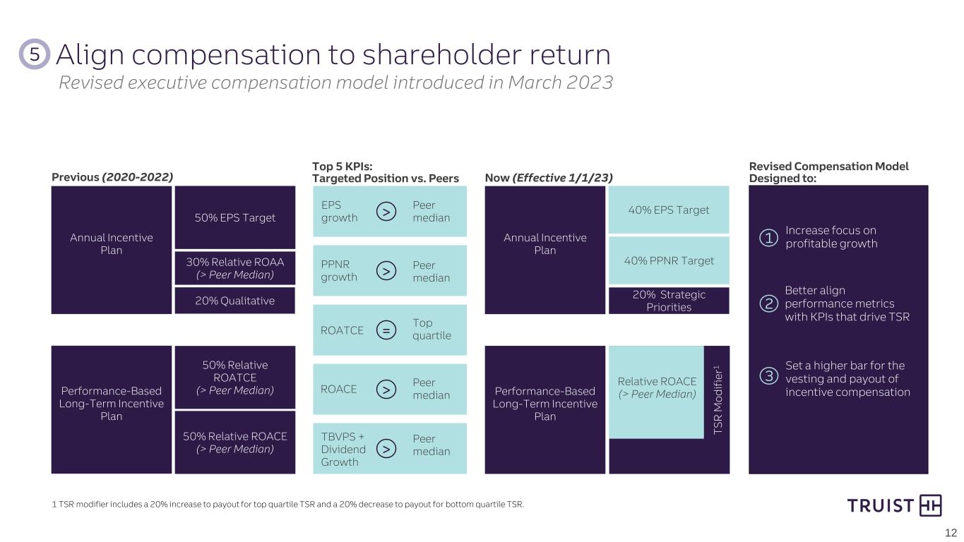 1 TSR modifier includes a 20% increase to payout for top quartile TSR and a 20% decrease to payout for bottom quartile TSR. Annual Incentive Plan Performance-Based Long-Term Incentive Plan 50% EPS Target 30% Relative ROAA (> Peer Median) 50% Relative ROATCE (> Peer Median) 50% Relative ROACE (> Peer Median) 20% Qualitative Previous (2020-2022) Annual Incentive Plan Performance-Based Long-Term Incentive Plan 40% EPS Target 20% Strategic Priorities 40% PPNR Target T SR M od ifi er 1 Relative ROACE (> Peer Median) Now (Effective 1/1/23) 12 Top 5 KPIs: Targeted Position vs. Peers 1 Increase focus on profitable growth Better align performance metrics with KPIs that drive TSR Set a higher bar for the vesting and payout of incentive compensation > > = > > Peer median PPNR growth ROATCE ROACE TBVPS + Dividend Growth EPS growth Peer median Peer median Peer median Top quartile Revised Compensation Model Designed to: 2 3 Revised executive compensation model introduced in March 2023 5 Align compensation to shareholder return