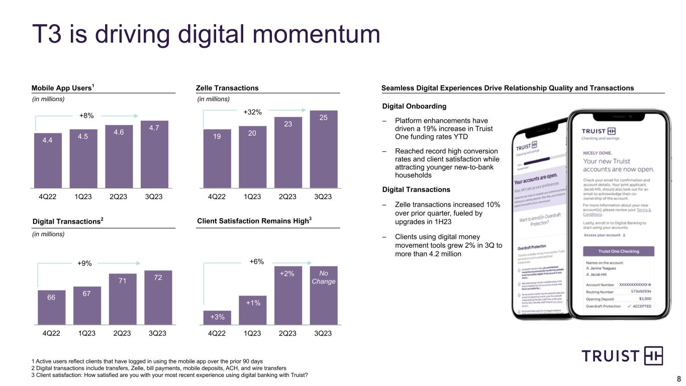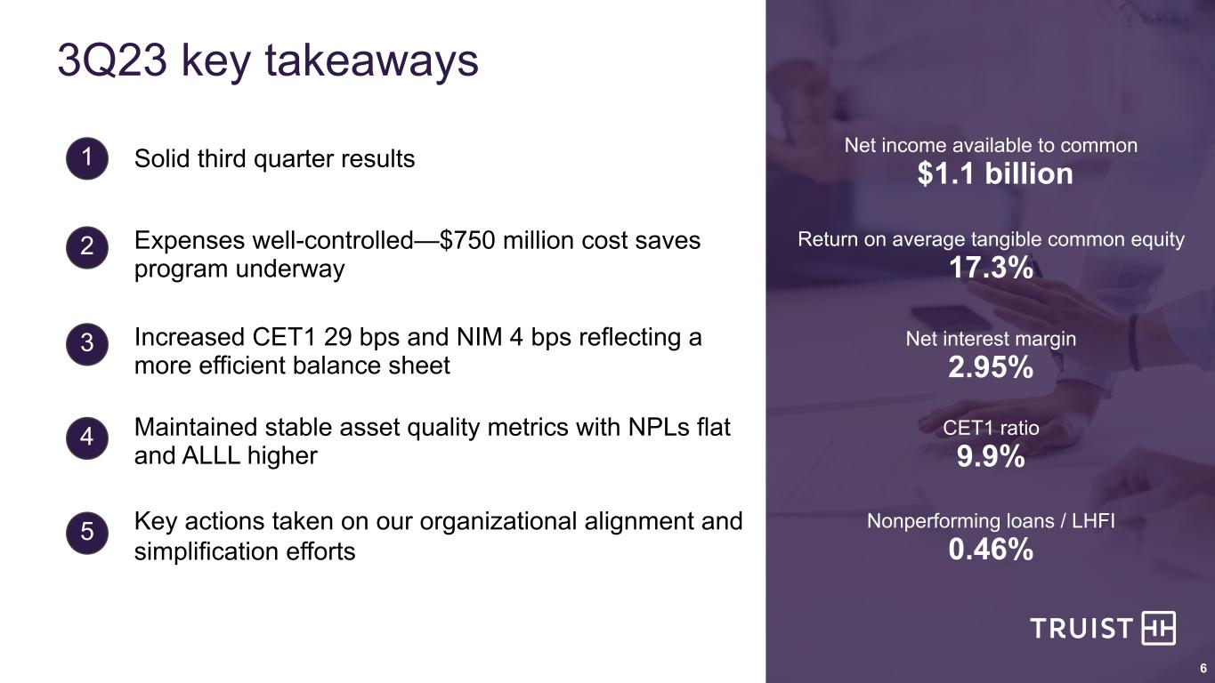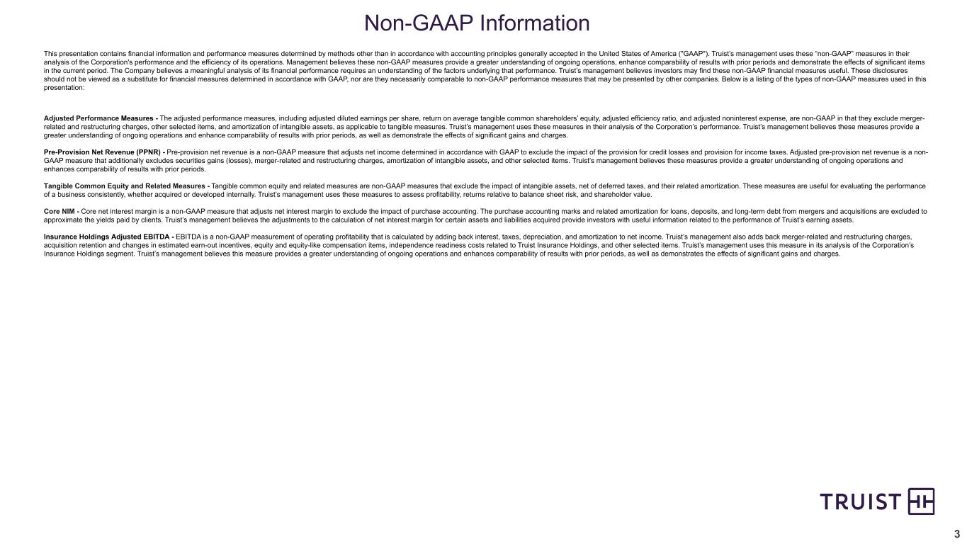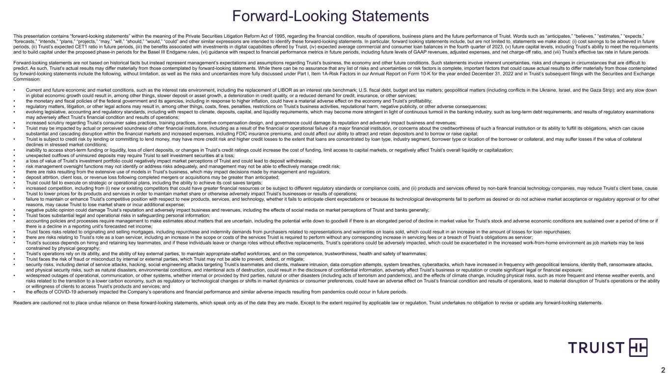 2 This presentation contains “forward-looking statements” within the meaning of the Private Securities Litigation Reform Act of 1995, regarding the financial condition, results of operations, business plans and the future performance of Truist. Words such as “anticipates,” “believes,” “estimates,” “expects,” “forecasts,” “intends,” “plans,” “projects,” “may,” “will,” “should,” “would,” “could” and other similar expressions are intended to identify these forward-looking statements. In particular, forward looking statements include, but are not limited to, statements we make about: (i) cost savings to be achieved in future periods, (ii) Truist’s expected CET1 ratio in future periods, (iii) the benefits associated with investments in digital capabilities offered by Truist, (iv) expected average commercial and consumer loan balances in the fourth quarter of 2023, (v) future capital levels, including Truist’s ability to meet the requirements and to build capital under the proposed phase-in periods for the Basel III Endgame rules, (vi) guidance with respect to financial performance metrics in future periods, including future levels of GAAP revenues, adjusted expenses, and net charge-off ratio, and (vii) Truist’s effective tax rate in future periods. Forward-looking statements are not based on historical facts but instead represent management’s expectations and assumptions regarding Truist’s business, the economy and other future conditions. Such statements involve inherent uncertainties, risks and changes in circumstances that are difficult to predict. As such, Truist’s actual results may differ materially from those contemplated by forward-looking statements. While there can be no assurance that any list of risks and uncertainties or risk factors is complete, important factors that could cause actual results to differ materially from those contemplated by forward-looking statements include the following, without limitation, as well as the risks and uncertainties more fully discussed under Part I, Item 1A-Risk Factors in our Annual Report on Form 10-K for the year ended December 31, 2022 and in Truist’s subsequent filings with the Securities and Exchange Commission: • Current and future economic and market conditions, such as the interest rate environment, including the replacement of LIBOR as an interest rate benchmark; U.S. fiscal debt, budget and tax matters; geopolitical matters (including conflicts in the Ukraine, Israel, and the Gaza Strip); and any slow down in global economic growth could result in, among other things, slower deposit or asset growth, a deterioration in credit quality, or a reduced demand for credit, insurance, or other services; • the monetary and fiscal policies of the federal government and its agencies, including in response to higher inflation, could have a material adverse effect on the economy and Truist’s profitability; • regulatory matters, litigation, or other legal actions may result in, among other things, costs, fines, penalties, restrictions on Truist’s business activities, reputational harm, negative publicity, or other adverse consequences; • evolving legislative, accounting and regulatory standards, including with respect to climate, deposits, capital, and liquidity requirements, which may become more stringent in light of continuous turmoil in the banking industry, such as long-term debt requirements, and results of regulatory examinations may adversely affect Truist’s financial condition and results of operations; • increased scrutiny regarding Truist’s consumer sales practices, training practices, incentive compensation design, and governance could damage its reputation and adversely impact business and revenues; • Truist may be impacted by actual or perceived soundness of other financial institutions, including as a result of the financial or operational failure of a major financial institution, or concerns about the creditworthiness of such a financial institution or its ability to fulfill its obligations, which can cause substantial and cascading disruption within the financial markets and increased expenses, including FDIC insurance premiums, and could affect our ability to attract and retain depositors and to borrow or raise capital; • Truist is subject to credit risk by lending or committing to lend money, may have more credit risk and higher credit losses to the extent that loans are concentrated by loan type, industry segment, borrower type or location of the borrower or collateral, and may suffer losses if the value of collateral declines in stressed market conditions; • inability to access short-term funding or liquidity, loss of client deposits, or changes in Truist’s credit ratings could increase the cost of funding, limit access to capital markets, or negatively affect Truist’s overall liquidity or capitalization; • unexpected outflows of uninsured deposits may require Truist to sell investment securities at a loss; • a loss of value of Truist’s investment portfolio could negatively impact market perceptions of Truist and could lead to deposit withdrawals; • risk management oversight functions may not identify or address risks adequately, and management may not be able to effectively manage credit risk; • there are risks resulting from the extensive use of models in Truist’s business, which may impact decisions made by management and regulators; • deposit attrition, client loss, or revenue loss following completed mergers or acquisitions may be greater than anticipated; • Truist could fail to execute on strategic or operational plans, including the ability to achieve its cost saves targets; • increased competition, including from (i) new or existing competitors that could have greater financial resources or be subject to different regulatory standards or compliance costs, and (ii) products and services offered by non-bank f