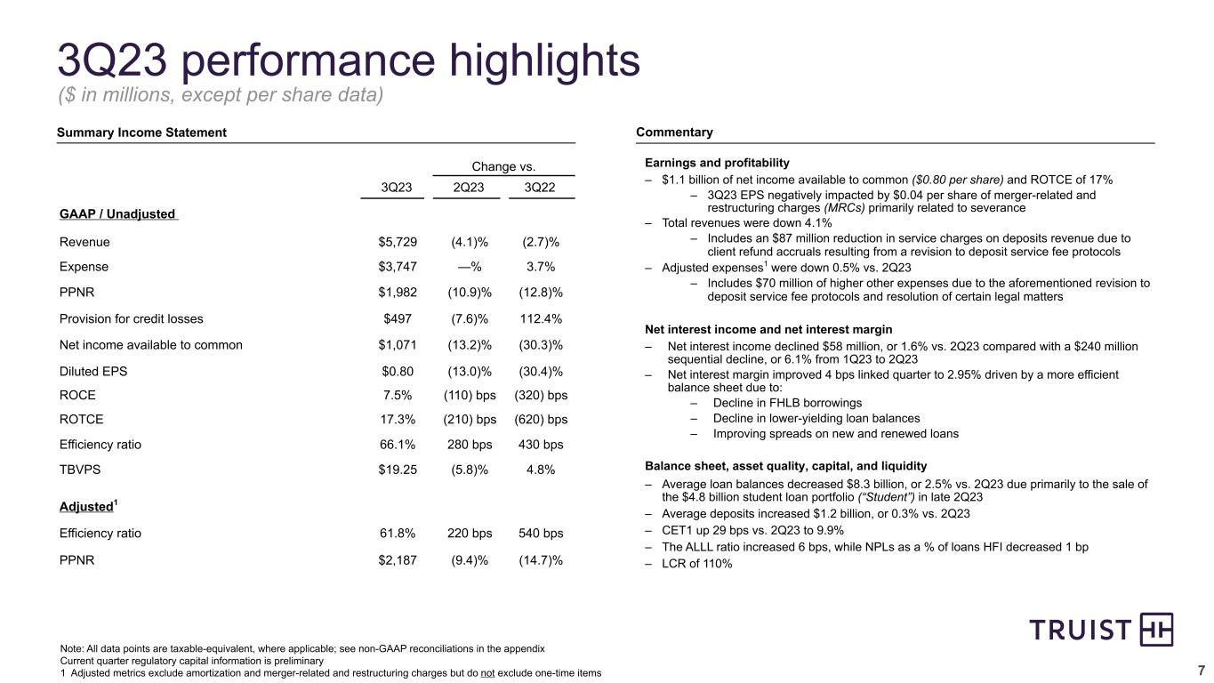6 3Q23 key takeaways 1 Solid third quarter results 2 Expenses well-controlled—$750 million cost saves program underway 3 Increased CET1 29 bps and NIM 4 bps reflecting a more efficient balance sheet 5 Key actions taken on our organizational alignment and simplification efforts Net income available to common $1.1 billion Return on average tangible common equity 17.3% Net interest margin 2.95% CET1 ratio 9.9% Nonperforming loans / LHFI 0.46% 4 Maintained stable asset quality metrics with NPLs flat and ALLL higher 6