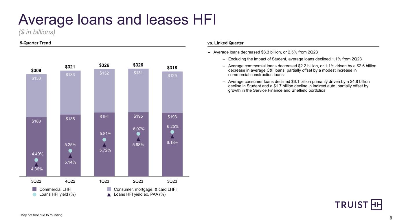 8 19 20 23 25 4Q22 1Q23 2Q23 3Q23 Seamless Digital Experiences Drive Relationship Quality and Transactions 4Q22 1Q23 2Q23 3Q23 T3 is driving digital momentum 4.4 4.5 4.6 4.7 4Q22 1Q23 2Q23 3Q23 1 Active users reflect clients that have logged in using the mobile app over the prior 90 days 2 Digital transactions include transfers, Zelle, bill payments, mobile deposits, ACH, and wire transfers 3 Client satisfaction: How satisfied are you with your most recent experience using digital banking with Truist? Mobile App Users1 Zelle Transactions Digital Transactions2 Client Satisfaction Remains High3 66 67 71 72 4Q22 1Q23 2Q23 3Q23 +3% +1% +2% +8% +32% +9% No Change +6% (in millions) (in millions) (in millions) Digital Onboarding – Platform enhancements have driven a 19% increase in Truist One funding rates YTD – Reached record high conversion rates and client satisfaction while attracting younger new-to-bank households Digital Transactions – Zelle transactions increased 10% over prior quarter, fueled by upgrades in 1H23 – Clients using digital money movement tools grew 2% in 3Q to more than 4.2 million