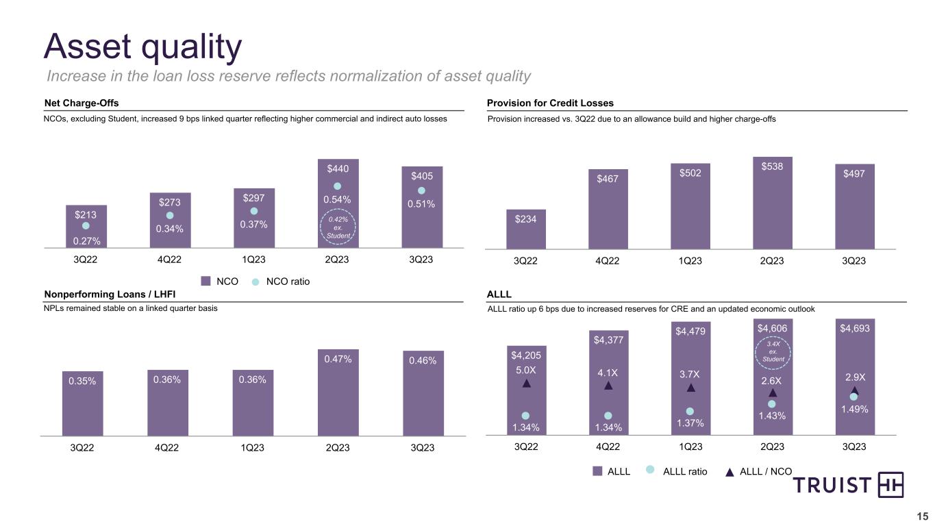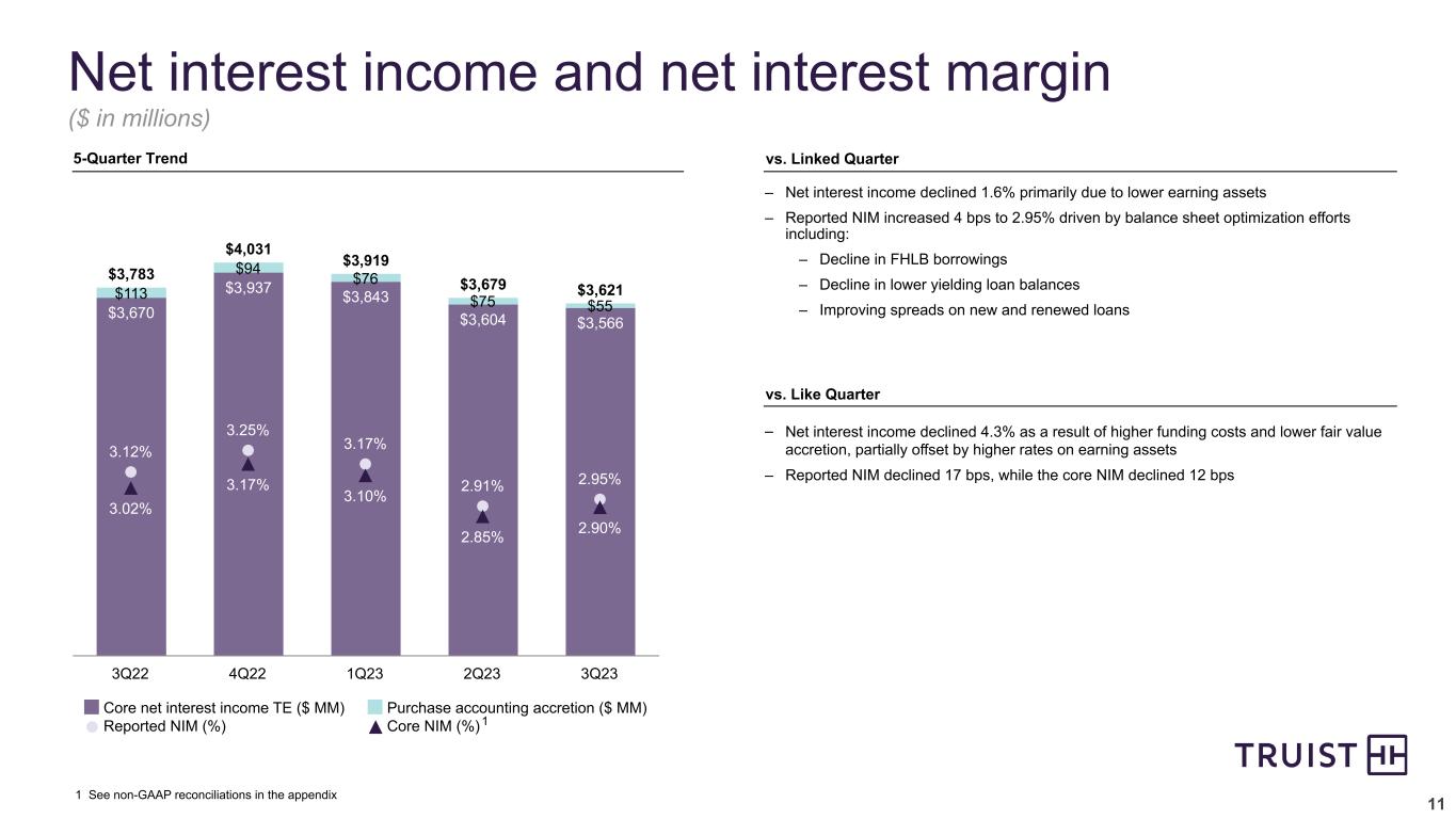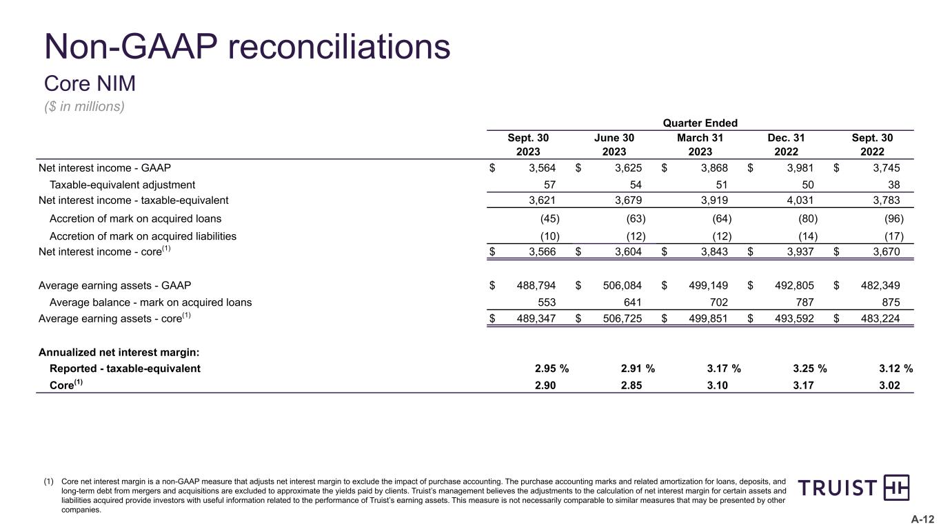 A-12 Quarter Ended Sept. 30 June 30 March 31 Dec. 31 Sept. 30 2023 2023 2023 2022 2022 Net interest income - GAAP $ 3,564 $ 3,625 $ 3,868 $ 3,981 $ 3,745 Taxable-equivalent adjustment 57 54 51 50 38 Net interest income - taxable-equivalent 3,621 3,679 3,919 4,031 3,783 Accretion of mark on acquired loans (45) (63) (64) (80) (96) Accretion of mark on acquired liabilities (10) (12) (12) (14) (17) Net interest income - core(1) $ 3,566 $ 3,604 $ 3,843 $ 3,937 $ 3,670 Average earning assets - GAAP $ 488,794 $ 506,084 $ 499,149 $ 492,805 $ 482,349 Average balance - mark on acquired loans 553 641 702 787 875 Average earning assets - core(1) $ 489,347 $ 506,725 $ 499,851 $ 493,592 $ 483,224 Annualized net interest margin: Reported - taxable-equivalent 2.95 % 2.91 % 3.17 % 3.25 % 3.12 % Core(1) 2.90 2.85 3.10 3.17 3.02 Non-GAAP reconciliations Core NIM ($ in millions) (1) Core net interest margin is a non-GAAP measure that adjusts net interest margin to exclude the impact of purchase accounting. The purchase accounting marks and related amortization for loans, deposits, and long-term debt from mergers and acquisitions are excluded to approximate the yields paid by clients. Truist’s management believes the adjustments to the calculation of net interest margin for certain assets and liabilities acquired provide investors with useful information related to the performance of Truist’s earning assets. This measure is not necessarily comparable to similar measures that may be presented by other companies.