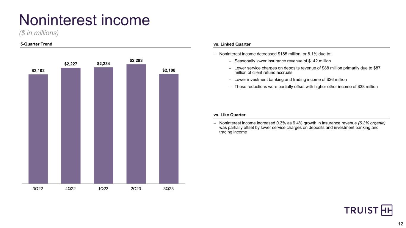 11 $3,783 $4,031 $3,919 $3,679 $3,621 $3,670 $3,937 $3,843 $3,604 $3,566 $113 $94 $76 $75 $55 3.12% 3.25% 3.17% 2.91% 2.95% 3.02% 3.17% 3.10% 2.85% 2.90% Core net interest income TE ($ MM) Purchase accounting accretion ($ MM) Reported NIM (%) Core NIM (%) 3Q22 4Q22 1Q23 2Q23 3Q23 – Net interest income declined 1.6% primarily due to lower earning assets – Reported NIM increased 4 bps to 2.95% driven by balance sheet optimization efforts including: – Decline in FHLB borrowings – Decline in lower yielding loan balances – Improving spreads on new and renewed loans – Net interest income declined 4.3% as a result of higher funding costs and lower fair value accretion, partially offset by higher rates on earning assets – Reported NIM declined 17 bps, while the core NIM declined 12 bps ($ in millions) Net interest income and net interest margin 1 See non-GAAP reconciliations in the appendix vs. Linked Quarter5-Quarter Trend 1 vs. Like Quarter