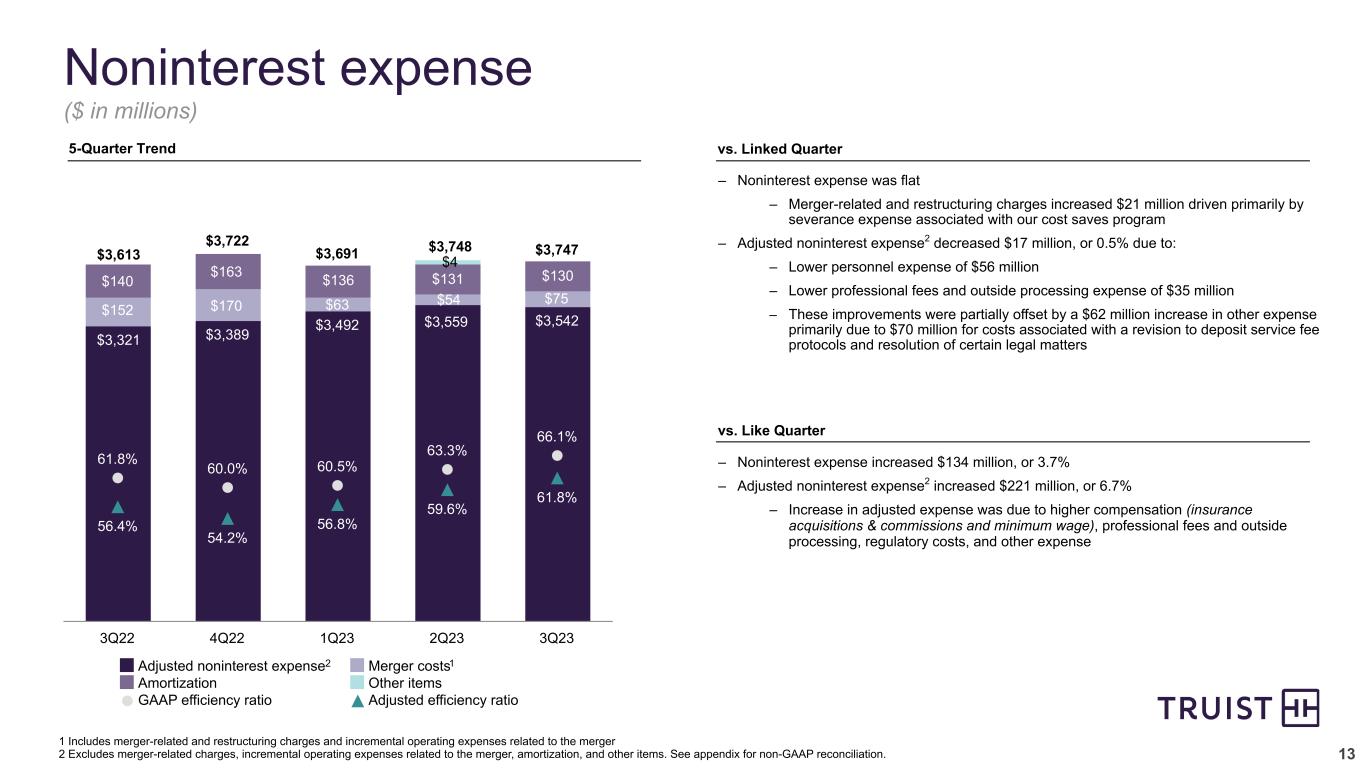 12 ($ in millions) $2,102 $2,227 $2,234 $2,293 $2,108 3Q22 4Q22 1Q23 2Q23 3Q23 Noninterest income vs. Linked Quarter5-Quarter Trend – Noninterest income decreased $185 million, or 8.1% due to: – Seasonally lower insurance revenue of $142 million – Lower service charges on deposits revenue of $88 million primarily due to $87 million of client refund accruals – Lower investment banking and trading income of $26 million – These reductions were partially offset with higher other income of $38 million vs. Like Quarter – Noninterest income increased 0.3% as 9.4% growth in insurance revenue (6.3% organic) was partially offset by lower service charges on deposits and investment banking and trading income