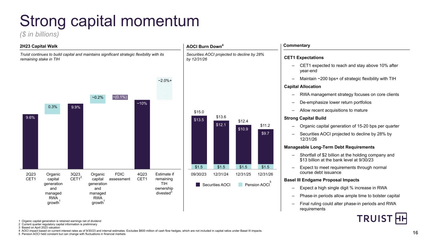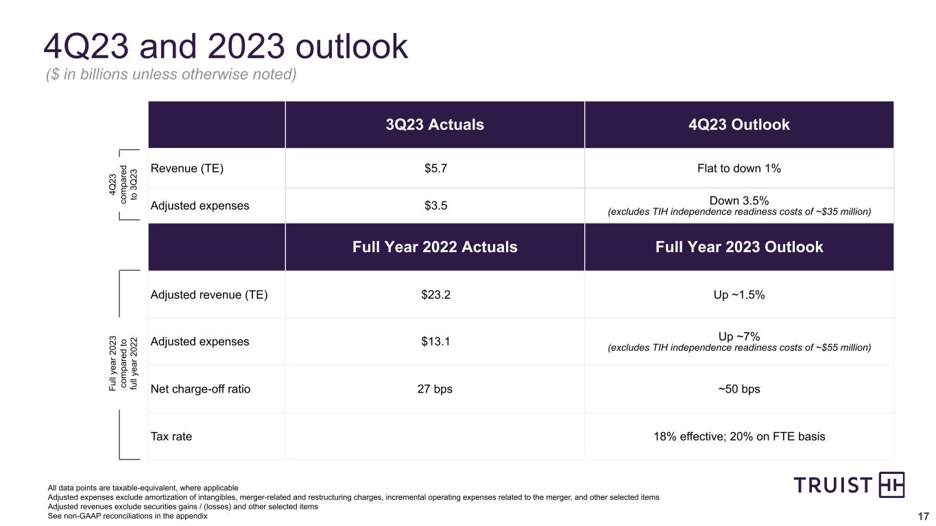 16 ($ in billions) 2Q23 CET1 Organic capital generation and managed RWA growth 3Q23 CET1 Organic capital generation and managed RWA growth FDIC assessment 4Q23 CET1 Strong capital momentum 1 Organic capital generation is retained earnings net of dividend 2 Current quarter regulatory capital information is preliminary 3 Based on April 2023 valuation 4 AOCI impact based on current interest rates as of 9/30/23 and internal estimates. Excludes $600 million of cash flow hedges, which are not included in capital ratios under Basel III impacts. 5 Pension AOCI held constant but can change with fluctuations in financial markets 9.6% 0.3% ~0.2% ~(0.1%) 9.9% ~10% Estimate if remaining TIH ownership divested3 ~2.0%+ 1 AOCI Burn Down42H23 Capital Walk Commentary CET1 Expectations – CET1 expected to reach and stay above 10% after year-end – Maintain ~200 bps+ of strategic flexibility with TIH Capital Allocation – RWA management strategy focuses on core clients – De-emphasize lower return portfolios – Allow recent acquisitions to mature Strong Capital Build – Organic capital generation of 15-20 bps per quarter – Securities AOCI projected to decline by 28% by 12/31/26 Manageable Long-Term Debt Requirements – Shortfall of $2 billion at the holding company and $13 billion at the bank level at 9/30/23 – Expect to meet requirements through normal course debt issuance Basel III Endgame Proposal Impacts – Expect a high single digit % increase in RWA – Phase-in periods allow ample time to bolster capital – Final ruling could alter phase-in periods and RWA requirements 1 2 Truist continues to build capital and maintains significant strategic flexibility with its remaining stake in TIH Securities AOCI projected to decline by 28% by 12/31/26 $15.0 $13.6 $12.4 $11.2 $1.5 $1.5 $1.5 $1.5 $13.5 $12.1 $10.9 $9.7 Securities AOCI Pension AOCI 09/30/23 12/31/24 12/31/25 12/31/26 5