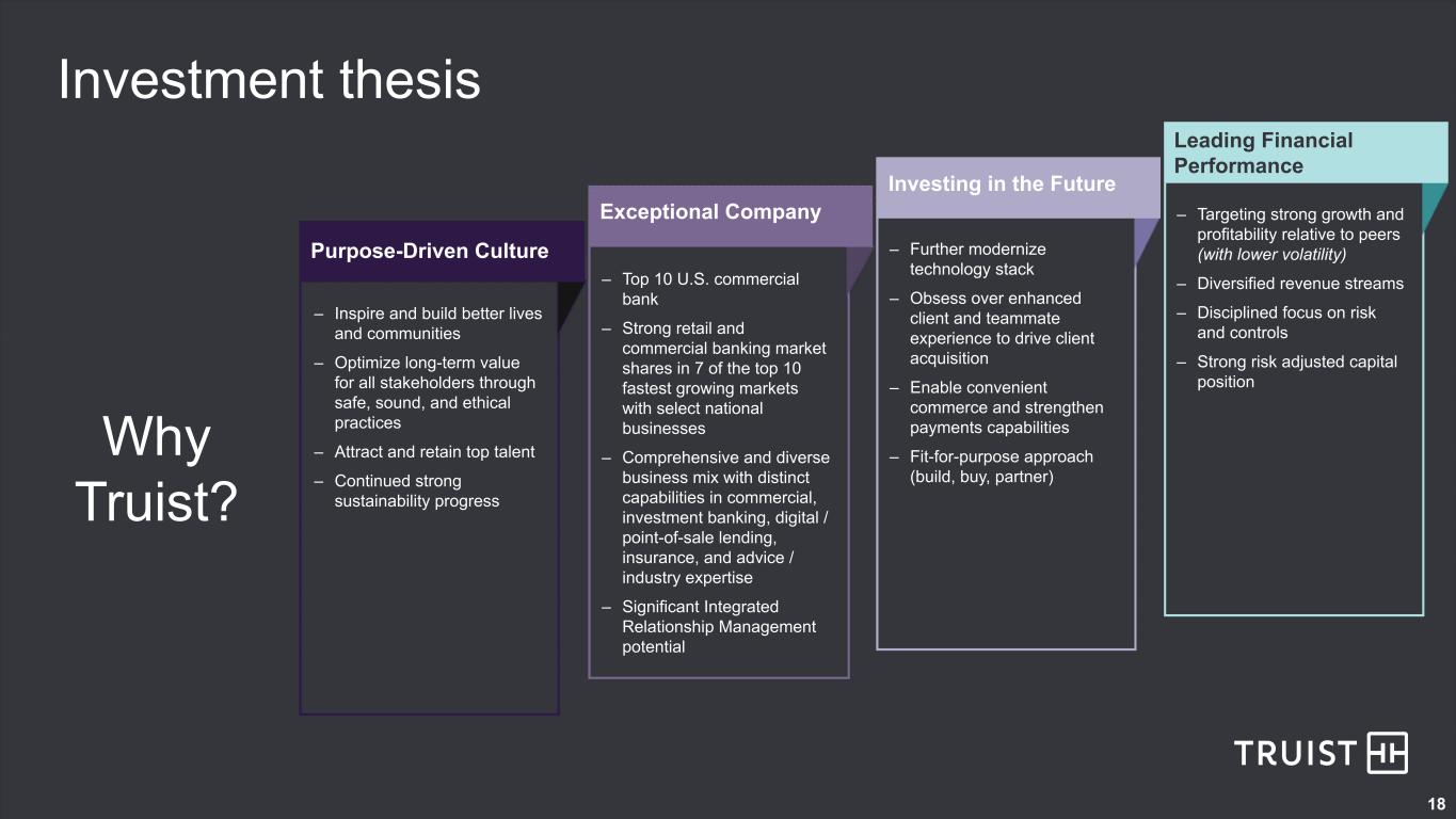 18 Investment thesis Why Truist? Purpose-Driven Culture Exceptional Company Investing in the Future Leading Financial Performance – Inspire and build better lives and communities – Optimize long-term value for all stakeholders through safe, sound, and ethical practices – Attract and retain top talent – Continued strong sustainability progress – Top 10 U.S. commercial bank – Strong retail and commercial banking market shares in 7 of the top 10 fastest growing markets with select national businesses – Comprehensive and diverse business mix with distinct capabilities in commercial, investment banking, digital / point-of-sale lending, insurance, and advice / industry expertise – Significant Integrated Relationship Management potential – Further modernize technology stack – Obsess over enhanced client and teammate experience to drive client acquisition – Enable convenient commerce and strengthen payments capabilities – Fit-for-purpose approach (build, buy, partner) – Targeting strong growth and profitability relative to peers (with lower volatility) – Diversified revenue streams – Disciplined focus on risk and controls – Strong risk adjusted capital position