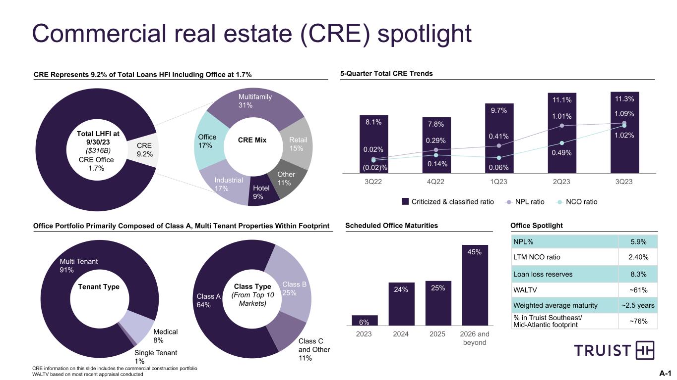 A-20 8.1% 7.8% 9.7% 11.1% 11.3% 0.02% 0.29% 0.41% 1.01% 1.09% 0.06% 0.49% 1.02% Criticized & classified ratio NPL ratio NCO ratio 3Q22 4Q22 1Q23 2Q23 3Q23 6% 24% 25% 45% 2023 2024 2025 2026 and beyond Office Portfolio Primarily Composed of Class A, Multi Tenant Properties Within Footprint Class A 64% Class B 25% Class C and Other 11% Commercial real estate (CRE) spotlight 5-Quarter Total CRE Trends CRE Office 1.7% Class Type (From Top 10 Markets) (0.02)% Total LHFI at 9/30/23 ($316B) CRE Mix Tenant Type Scheduled Office Maturities CRE Represents 9.2% of Total Loans HFI Including Office at 1.7% NPL% 5.9% LTM NCO ratio 2.40% Loan loss reserves 8.3% WALTV ~61% Weighted average maturity ~2.5 years % in Truist Southeast/ Mid-Atlantic footprint ~76% Office Spotlight All other loans 91.1% CRE information on this slide includes the commercial construction portfolio WALTV based on most recent appraisal conducted CRE 9.2% 0.14% Hotel 9% Industrial 17% Office 17% Multifamily 31% Retail 15% Other 11% A-1 Multi Tenant 91% Medical 8% Single Tenant 1%