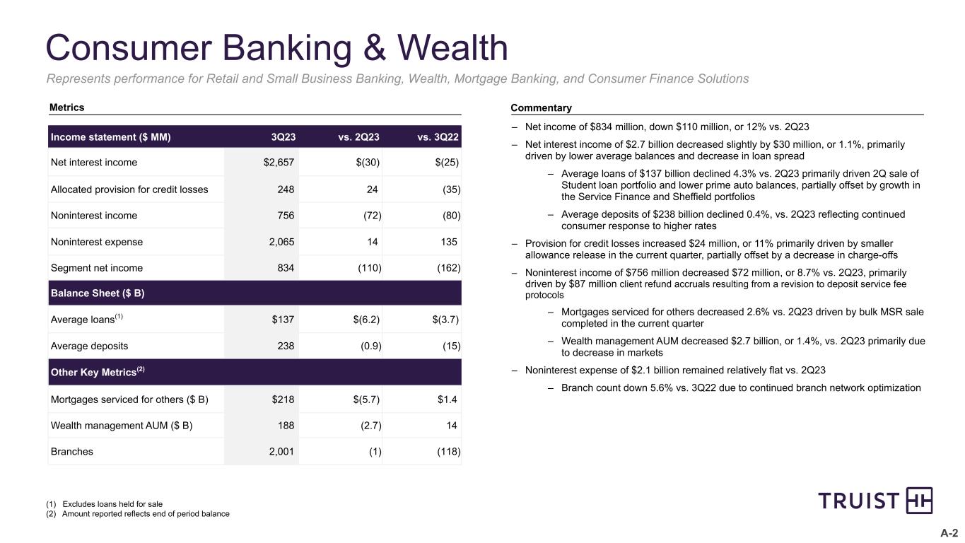 A-2 Consumer Banking & Wealth Income statement ($ MM) 3Q23 vs. 2Q23 vs. 3Q22 Net interest income $2,657 $(30) $(25) Allocated provision for credit losses 248 24 (35) Noninterest income 756 (72) (80) Noninterest expense 2,065 14 135 Segment net income 834 (110) (162) Balance Sheet ($ B) Average loans(1) $137 $(6.2) $(3.7) Average deposits 238 (0.9) (15) Other Key Metrics(2) Mortgages serviced for others ($ B) $218 $(5.7) $1.4 Wealth management AUM ($ B) 188 (2.7) 14 Branches 2,001 (1) (118) (1) Excludes loans held for sale (2) Amount reported reflects end of period balance Represents performance for Retail and Small Business Banking, Wealth, Mortgage Banking, and Consumer Finance Solutions – Net income of $834 million, down $110 million, or 12% vs. 2Q23 – Net interest income of $2.7 billion decreased slightly by $30 million, or 1.1%, primarily driven by lower average balances and decrease in loan spread – Average loans of $137 billion declined 4.3% vs. 2Q23 primarily driven 2Q sale of Student loan portfolio and lower prime auto balances, partially offset by growth in the Service Finance and Sheffield portfolios – Average deposits of $238 billion declined 0.4%, vs. 2Q23 reflecting continued consumer response to higher rates – Provision for credit losses increased $24 million, or 11% primarily driven by smaller allowance release in the current quarter, partially offset by a decrease in charge-offs – Noninterest income of $756 million decreased $72 million, or 8.7% vs. 2Q23, primarily driven by $87 million client refund accruals resulting from a revision to deposit service fee protocols – Mortgages serviced for others decreased 2.6% vs. 2Q23 driven by bulk MSR sale completed in the current quarter – Wealth management AUM decreased $2.7 billion, or 1.4%, vs. 2Q23 primarily due to decrease in markets – Noninterest expense of $2.1 billion remained relatively flat vs. 2Q23 – Branch count down 5.6% vs. 3Q22 due to continued branch network optimization Metrics Commentary