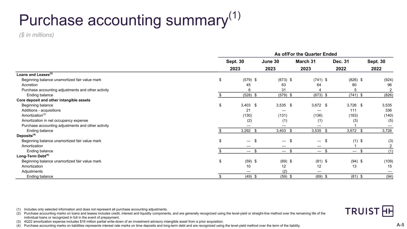 A-5 Purchase accounting summary(1) ($ in millions) As of/For the Quarter Ended Sept. 30 June 30 March 31 Dec. 31 Sept. 30 2023 2023 2023 2022 2022 Loans and Leases(2) Beginning balance unamortized fair value mark $ (579) $ (673) $ (741) $ (826) $ (924) Accretion 45 63 64 80 96 Purchase accounting adjustments and other activity 6 31 4 5 2 Ending balance $ (528) $ (579) $ (673) $ (741) $ (826) Core deposit and other intangible assets Beginning balance $ 3,403 $ 3,535 $ 3,672 $ 3,726 $ 3,535 Additions - acquisitions 21 — — 111 336 Amortization(3) (130) (131) (136) (163) (140) Amortization in net occupancy expense (2) (1) (1) (3) (5) Purchase accounting adjustments and other activity — — — 1 — Ending balance $ 3,292 $ 3,403 $ 3,535 $ 3,672 $ 3,726 Deposits(4) Beginning balance unamortized fair value mark $ — $ — $ — $ (1) $ (3) Amortization — — — 1 2 Ending balance $ — $ — $ — $ — $ (1) Long-Term Debt(4) Beginning balance unamortized fair value mark $ (59) $ (69) $ (81) $ (94) $ (109) Amortization 10 12 12 13 15 Adjustments — (2) — — Ending balance $ (49) $ (59) $ (69) $ (81) $ (94) (1) Includes only selected information and does not represent all purchase accounting adjustments. (2) Purchase accounting marks on loans and leases includes credit, interest and liquidity components, and are generally recognized using the level-yield or straight-line method over the remaining life of the individual loans or recognized in full in the event of prepayment. (3) 4Q22 amortization expense includes $16 million partial write-down of an investment advisory intangible asset from a prior acquisition. (4) Purchase accounting marks on liabilities represents interest rate marks on time deposits and long-term debt and are recognized using the level-yield method over the term of the liability.