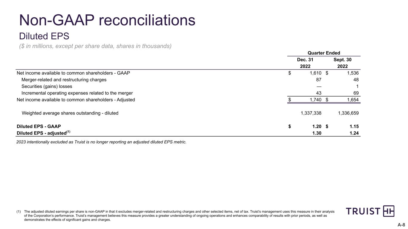 A-8 Quarter Ended Dec. 31 Sept. 30 2022 2022 Net income available to common shareholders - GAAP $ 1,610 $ 1,536 Merger-related and restructuring charges 87 48 Securities (gains) losses — 1 Incremental operating expenses related to the merger 43 69 Net income available to common shareholders - Adjusted $ 1,740 $ 1,654 Weighted average shares outstanding - diluted 1,337,338 1,336,659 Diluted EPS - GAAP $ 1.20 $ 1.15 Diluted EPS - adjusted(1) 1.30 1.24 Non-GAAP reconciliations Diluted EPS ($ in millions, except per share data, shares in thousands) (1) The adjusted diluted earnings per share is non-GAAP in that it excludes merger-related and restructuring charges and other selected items, net of tax. Truist’s management uses this measure in their analysis of the Corporation’s performance. Truist’s management believes this measure provides a greater understanding of ongoing operations and enhances comparability of results with prior periods, as well as demonstrates the effects of significant gains and charges. 2023 intentionally excluded as Truist is no longer reporting an adjusted diluted EPS metric.