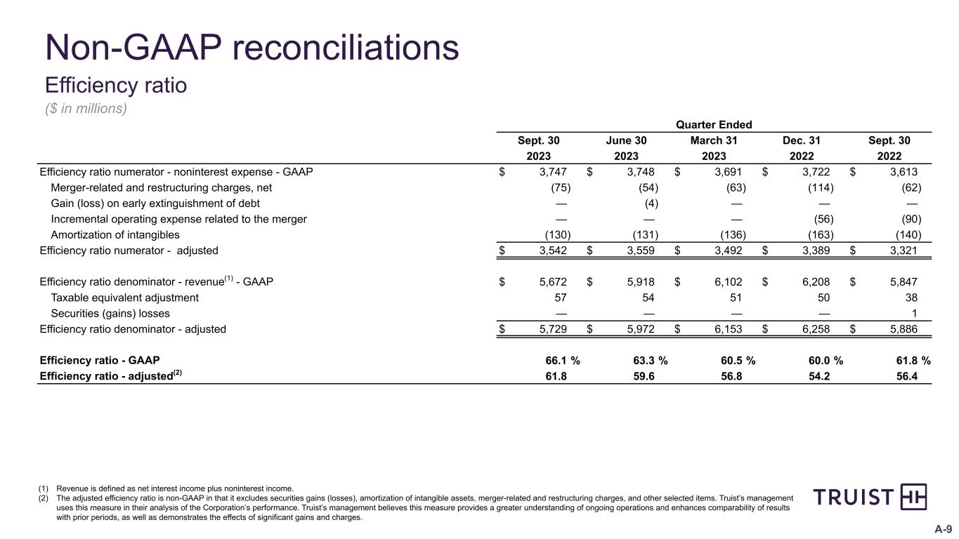A-9 Non-GAAP reconciliations Efficiency ratio ($ in millions) (1) Revenue is defined as net interest income plus noninterest income. (2) The adjusted efficiency ratio is non-GAAP in that it excludes securities gains (losses), amortization of intangible assets, merger-related and restructuring charges, and other selected items. Truist’s management uses this measure in their analysis of the Corporation’s performance. Truist’s management believes this measure provides a greater understanding of ongoing operations and enhances comparability of results with prior periods, as well as demonstrates the effects of significant gains and charges. Quarter Ended Sept. 30 June 30 March 31 Dec. 31 Sept. 30 2023 2023 2023 2022 2022 Efficiency ratio numerator - noninterest expense - GAAP $ 3,747 $ 3,748 $ 3,691 $ 3,722 $ 3,613 Merger-related and restructuring charges, net (75) (54) (63) (114) (62) Gain (loss) on early extinguishment of debt — (4) — — — Incremental operating expense related to the merger — — — (56) (90) Amortization of intangibles (130) (131) (136) (163) (140) Efficiency ratio numerator - adjusted $ 3,542 $ 3,559 $ 3,492 $ 3,389 $ 3,321 Efficiency ratio denominator - revenue(1) - GAAP $ 5,672 $ 5,918 $ 6,102 $ 6,208 $ 5,847 Taxable equivalent adjustment 57 54 51 50 38 Securities (gains) losses — — — — 1 Efficiency ratio denominator - adjusted $ 5,729 $ 5,972 $ 6,153 $ 6,258 $ 5,886 Efficiency ratio - GAAP 66.1 % 63.3 % 60.5 % 60.0 % 61.8 % Efficiency ratio - adjusted(2) 61.8 59.6 56.8 54.2 56.4