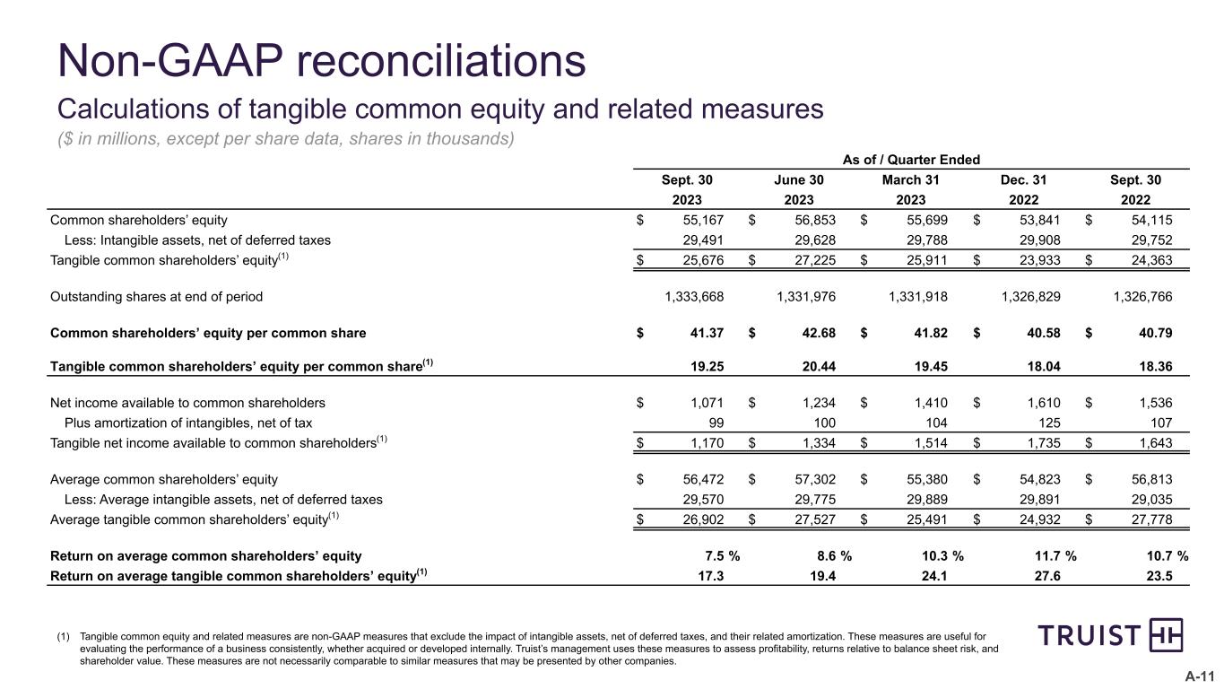 A-11 Non-GAAP reconciliations Calculations of tangible common equity and related measures ($ in millions, except per share data, shares in thousands) (1) Tangible common equity and related measures are non-GAAP measures that exclude the impact of intangible assets, net of deferred taxes, and their related amortization. These measures are useful for evaluating the performance of a business consistently, whether acquired or developed internally. Truist’s management uses these measures to assess profitability, returns relative to balance sheet risk, and shareholder value. These measures are not necessarily comparable to similar measures that may be presented by other companies. As of / Quarter Ended Sept. 30 June 30 March 31 Dec. 31 Sept. 30 2023 2023 2023 2022 2022 Common shareholders’ equity $ 55,167 $ 56,853 $ 55,699 $ 53,841 $ 54,115 Less: Intangible assets, net of deferred taxes 29,491 29,628 29,788 29,908 29,752 Tangible common shareholders’ equity(1) $ 25,676 $ 27,225 $ 25,911 $ 23,933 $ 24,363 Outstanding shares at end of period 1,333,668 1,331,976 1,331,918 1,326,829 1,326,766 Common shareholders’ equity per common share $ 41.37 $ 42.68 $ 41.82 $ 40.58 $ 40.79 Tangible common shareholders’ equity per common share(1) 19.25 20.44 19.45 18.04 18.36 Net income available to common shareholders $ 1,071 $ 1,234 $ 1,410 $ 1,610 $ 1,536 Plus amortization of intangibles, net of tax 99 100 104 125 107 Tangible net income available to common shareholders(1) $ 1,170 $ 1,334 $ 1,514 $ 1,735 $ 1,643 Average common shareholders’ equity $ 56,472 $ 57,302 $ 55,380 $ 54,823 $ 56,813 Less: Average intangible assets, net of deferred taxes 29,570 29,775 29,889 29,891 29,035 Average tangible common shareholders’ equity(1) $ 26,902 $ 27,527 $ 25,491 $ 24,932 $ 27,778 Return on average common shareholders’ equity 7.5 % 8.6 % 10.3 % 11.7 % 10.7 % Return on average tangible common shareholders’ equity(1) 17.3 19.4 24.1 27.6 23.5